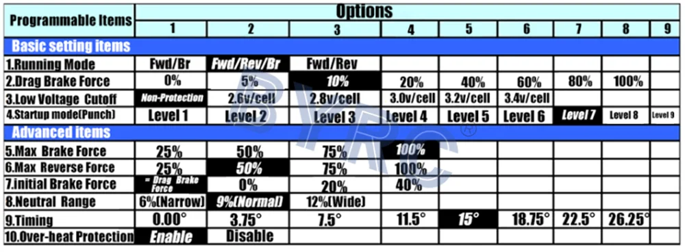 8. Несколько функций защиты: защита от низкого напряжения (поддержка литиевой батареи и никель-металлогидридных батарей), защита от температуры, защита от дроссельной заслонки, защита от блокировки ротора;