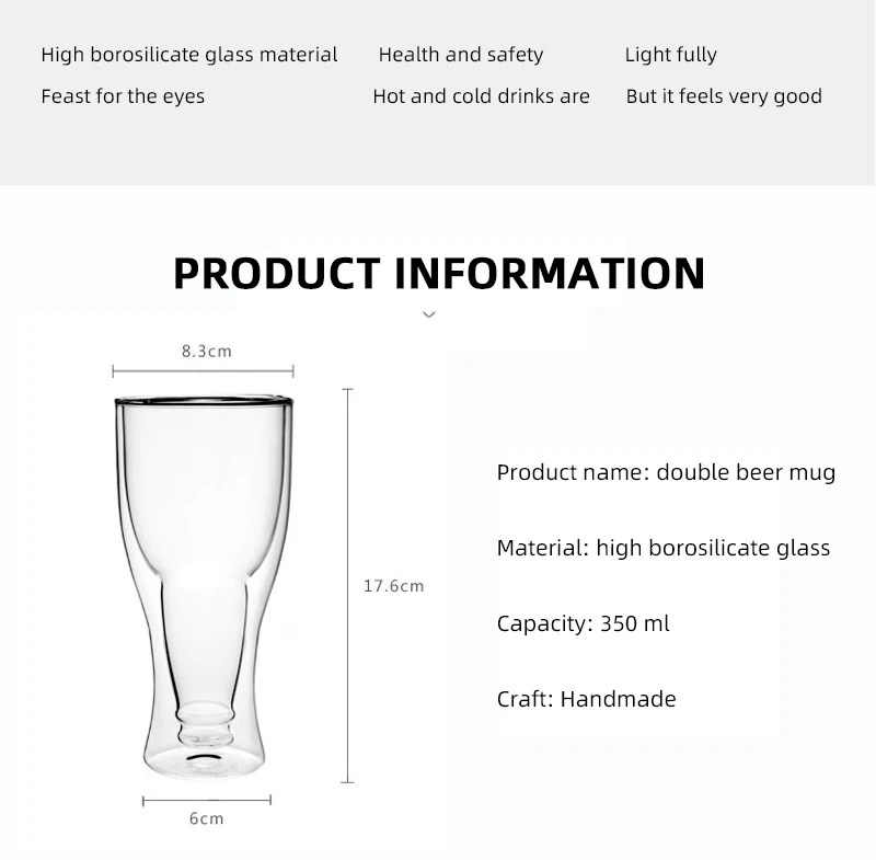350 мл пивная кружка (220 г ± 15 г): высота 180 мм, диаметр рта 85 мм, диаметр дна 65 мм