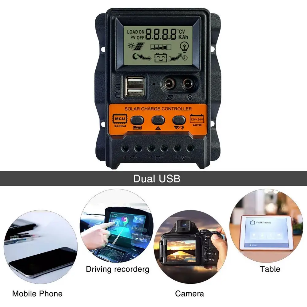 12 В/24 В умная солнечная панель Contrller PWM ЖК-дисплей Контроллер заряда солнечной батареи Регулятор двойной USB портХарактеристики: