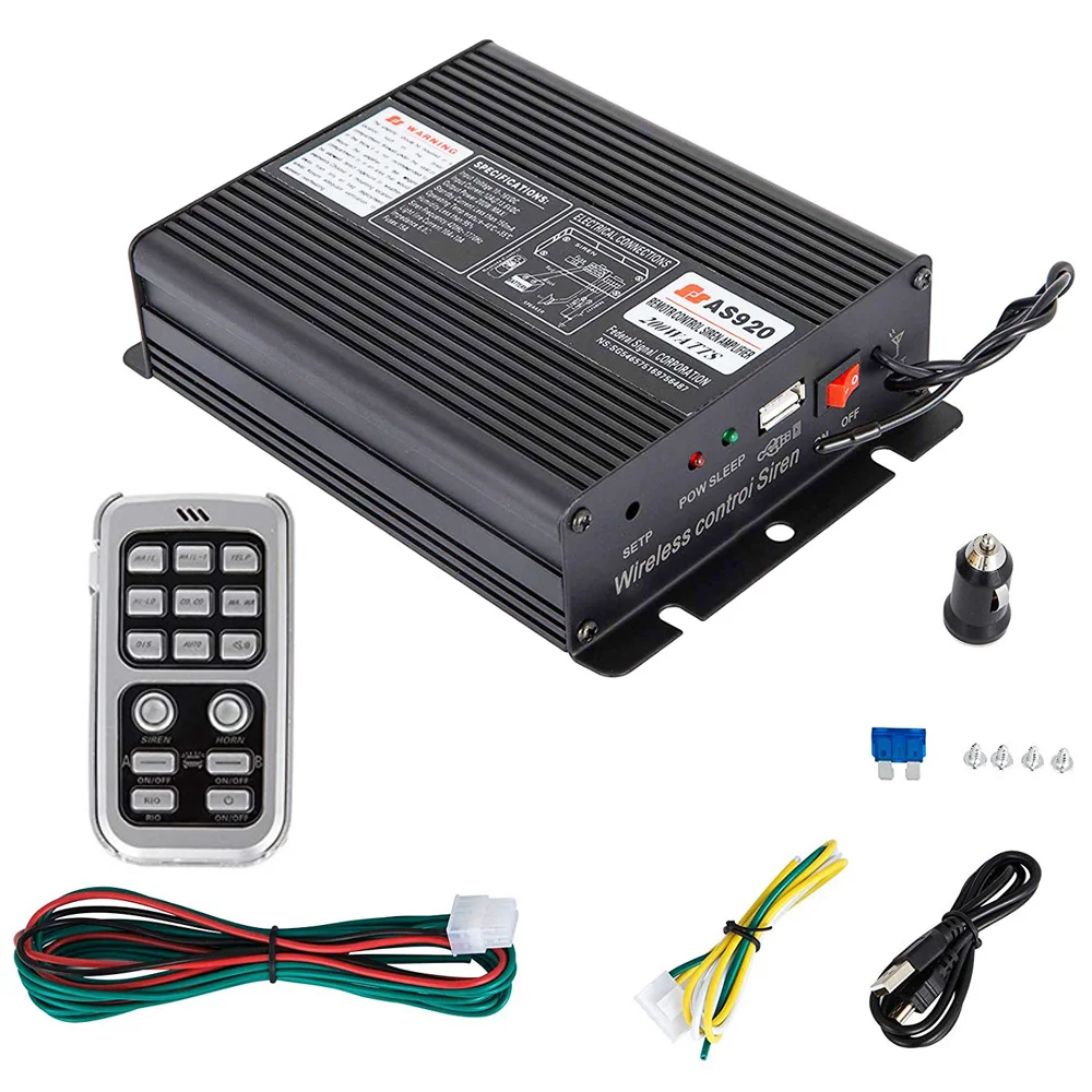 AS 920-это беспроводная многофункциональная полицейская сирена мощностью 200 Вт. Поставляется с пластиковым квадратным входным динамиком и беспроводным дистанционным портативным микрофоном
