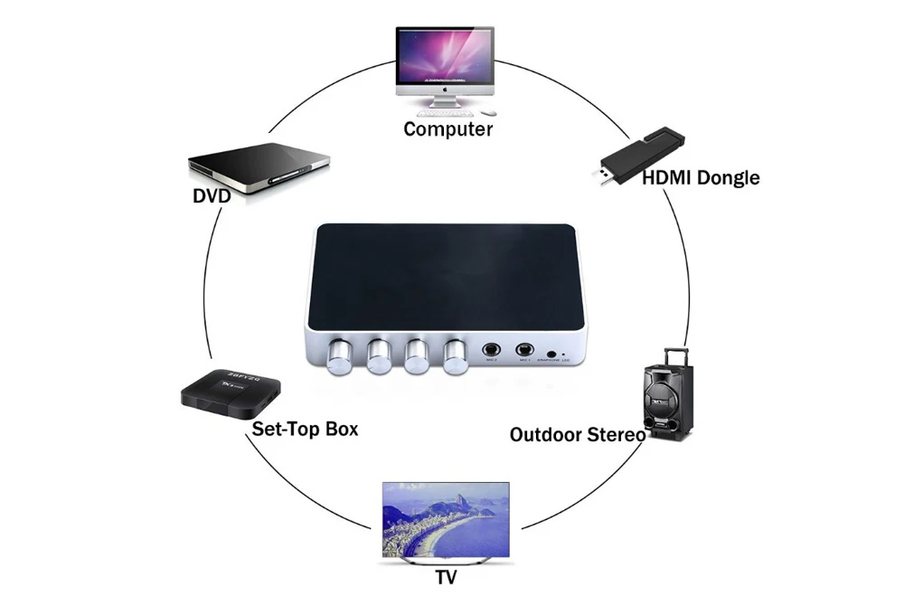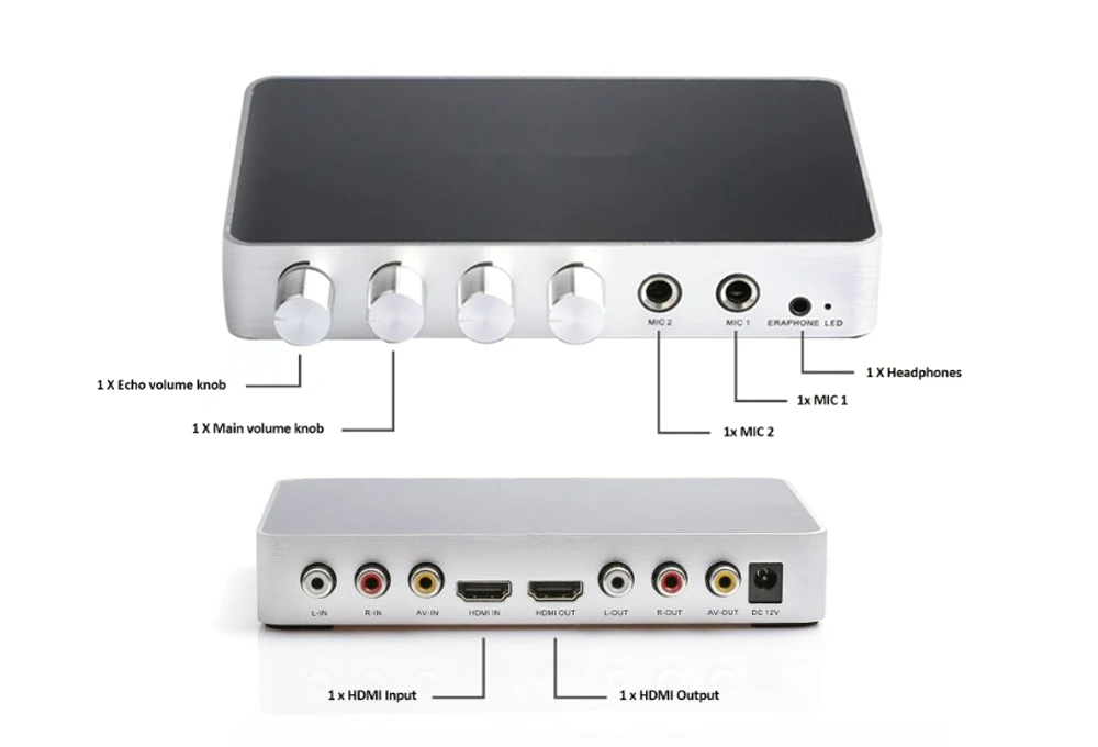 Миксер Karaoke HDMI поддерживает смешанные аудио из 2 различных микрофонов и позволяет регулировать громкость музыки, громкость эха, индивидуальный громкость микрофона. Между тем, предлагаем Вам превосходное качество стерео аудио.