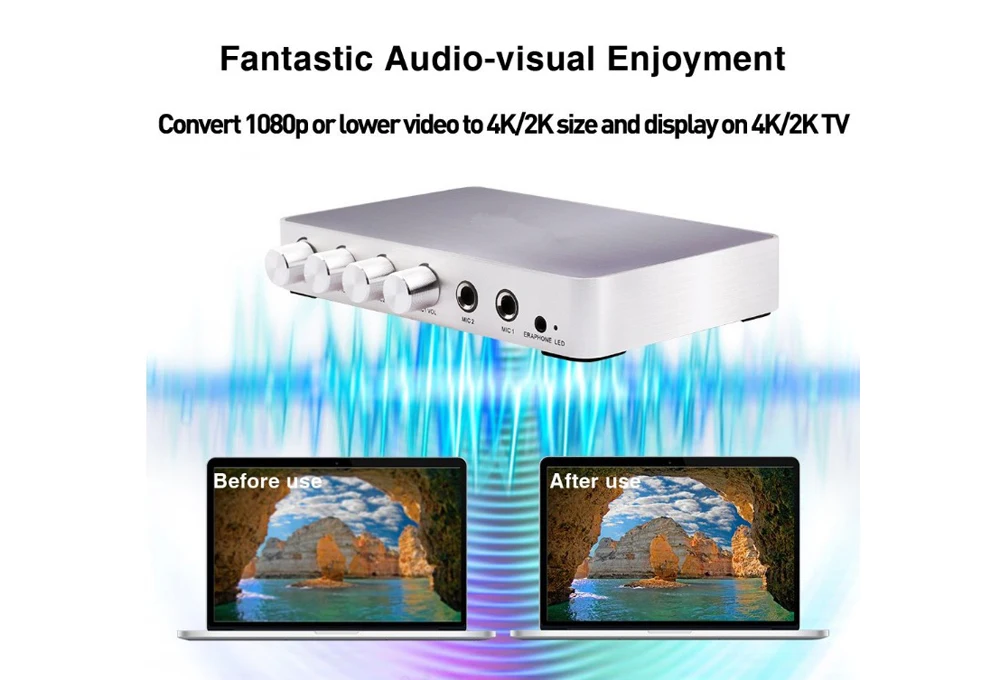 Караоке-миксер отлично работает с сканером 4K/2K и может конвертировать видео 1080P или более низкого качества в улучшенное соотношение разрешения 4K/2K, которое приносит вам полный разный Аудиовизуальный опыт.