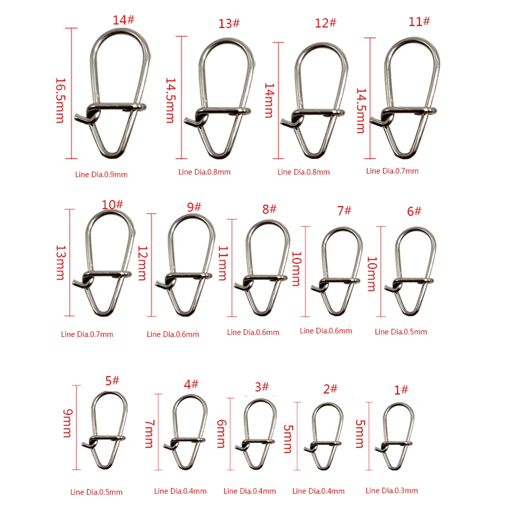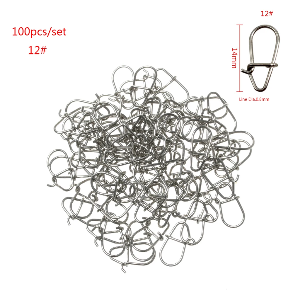 100% новый и высокое качество. Простой дизайн для удобства эксплуатации. Материал: нержавеющая сталь Количество: 100 шт. Размер: 1 #-12 # Посылка включает в себя: 100 шт. рыболовная подвесная защелка.