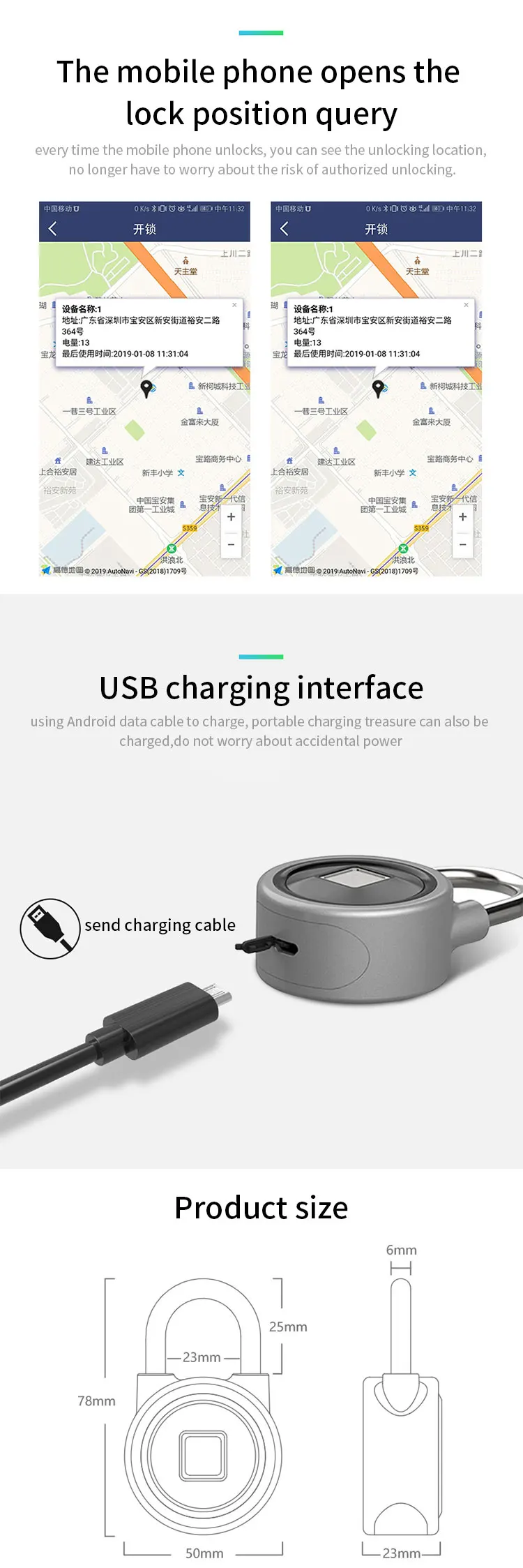 Этот умный USB замок отпечатков пальцев использует одну секунду технологии идентификации отпечатков пальцев, а полупроводниковая Жилая Идентификация отпечатков пальцев имеет очень высокий фактор безопасности. Он имеет два вида способов разблокировки: разблокировка отпечатков пальцев и мобильное приложение. Он может удаленно поделиться ключом, чтобы разблокировать wechat и мобильное приложение, проверить мощность в режиме реального времени, проверить разблокировку записи, разблокировать запрос о местоположении и другие функции. Емкость замка отпечатков пальцев может вводить 15 отпечатков пальцев, и встроенный литиевый аккумулятор, он также может быть перезаряжен через интерфейс USB. Срок службы может составлять 90 дней после зарядки в течение 1 часа. Подходит для багажа, багажника, ворот, контейнера, велосипеда, обувного шкафа и других мест.