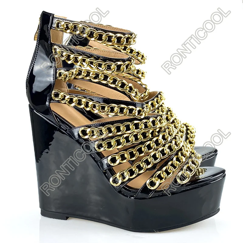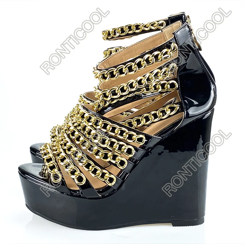 Ronticool/Женские глянцевые сандалии ручной работы с золотой цепочкой; Туфли на танкетке с открытым носком; Черные туфли для ночного клуба; Женская обувь американского размера плюс 5-20