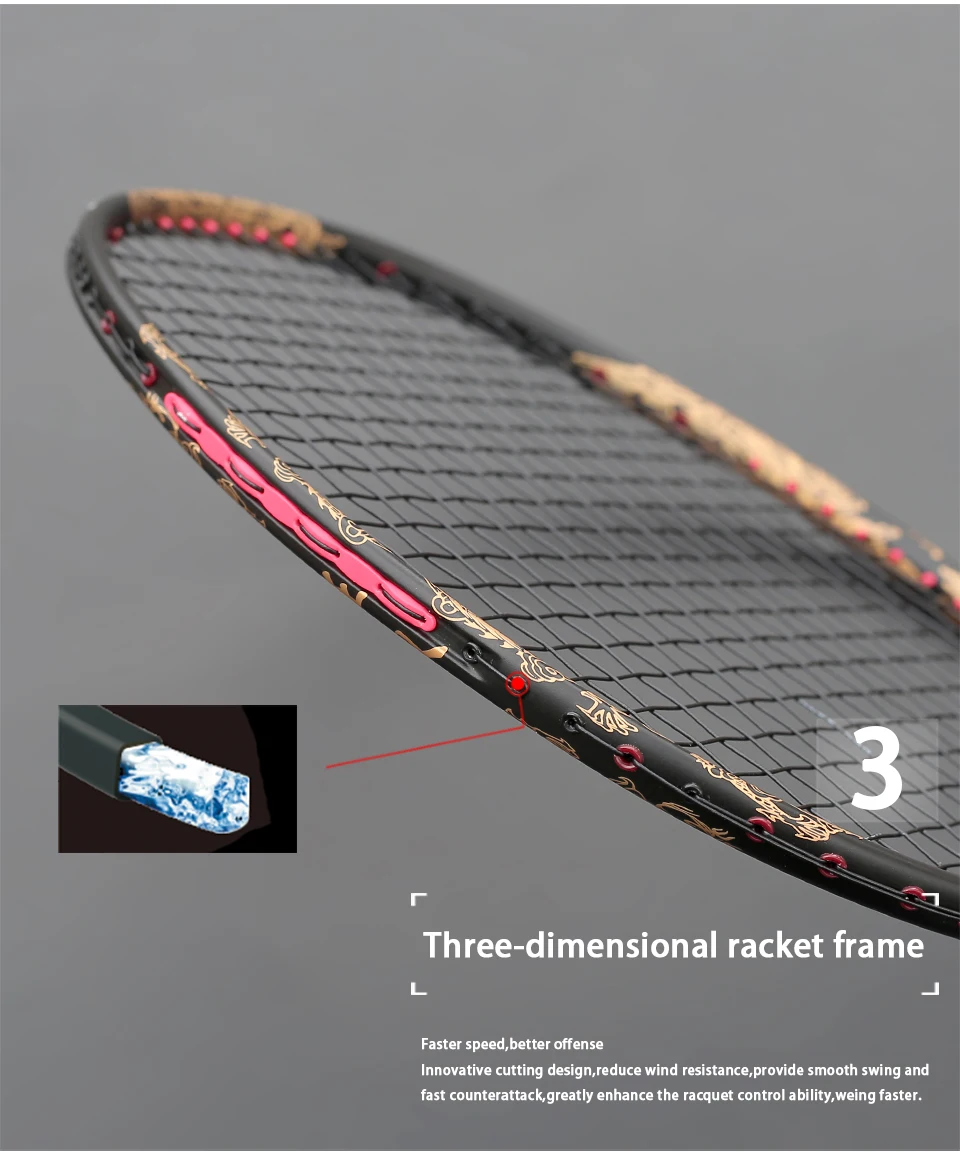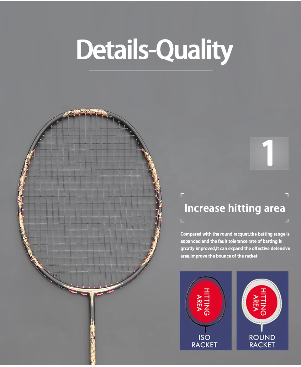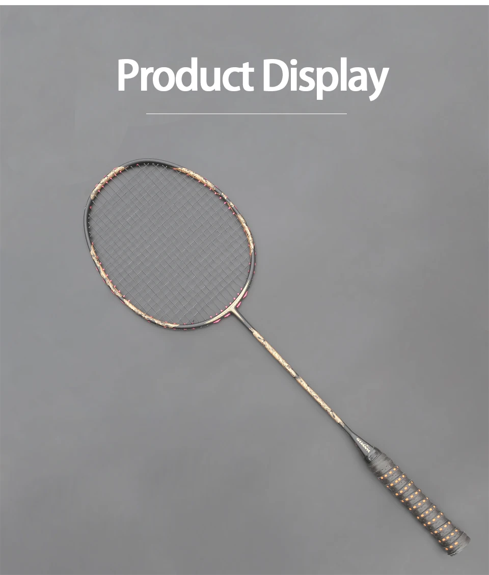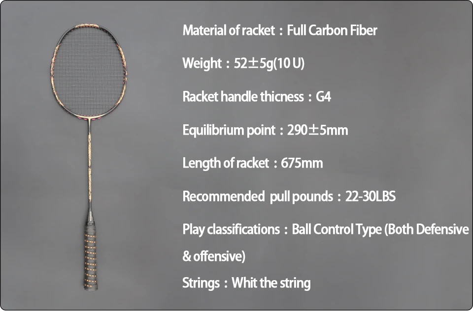 Weight - 10U Net weight only 52-55g without the string & overgrip & plastic film,anyone can control the racket effortless ; CARBON FIBER - he racket more lighter but stronger , so the tension can up to 30LBS,suitable the begining and the profesional player ; BALANCE OF THE RACKET - Racket have the best balance of weight&power,so the racket can easly to break out the power and make the offensive can`t be stop. FREE SERVICE - We can offer the free service of string and the overgrip,so you can play immediately when you get the racket. Gift : 1- Free String Service By Digital String Machine; 2- 1piece Comfortable Color Overgrip; 3-1Piece Carrying Bag