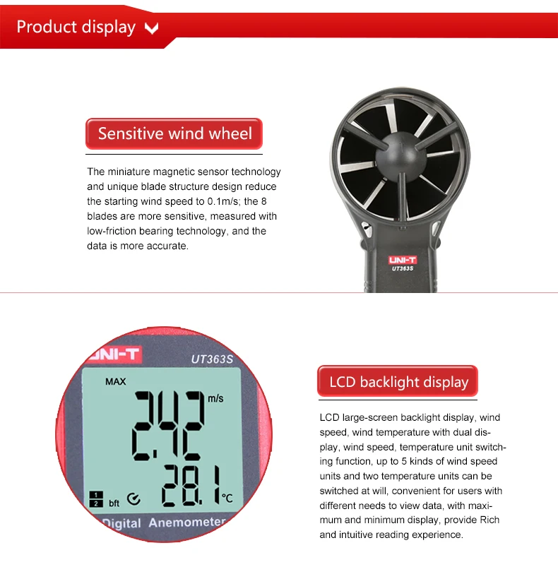 UT363S-это стабильный, безопасный и надежный Анемометр сплит-типа, обеспечивающий быстрое обнаружение, низкое потребление и высокую точность.
