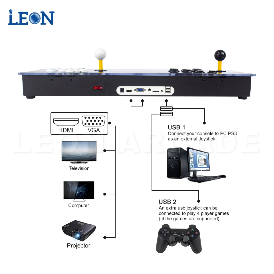 1280x720P HD графика.Полностью совместим со всеми hd-телевизорами/мониторами и проекторами.Купите 2 геймпада и usb-хаб (Подключите к нижнему usb-порту)