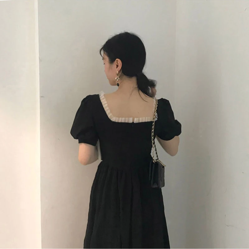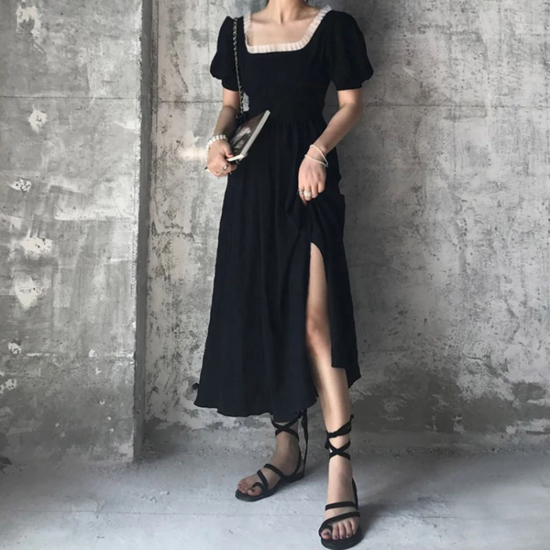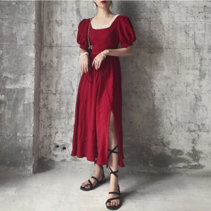 Винтажное плиссированное платье красного дворца с квадратным вырезом, летние женские платья с открытой спиной и пышными рукавами, трапециевидные вечерние платья с высокой талией и разрезом по подолу