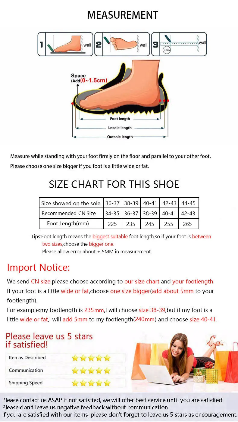 1. Мы отправляем китайские размеры (Китайский размер), пожалуйста, выбирайте в соответствии с нашей таблицей размеров и длиной Вашей стопы, это очень важно. Если ваша стопа немного широкая или толстая, выберите на один размер больше (Добавьте примерно 5 мм к длине вашей стопы).