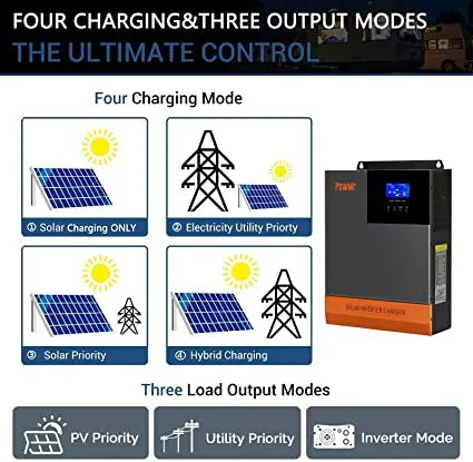 3. Доступно в 4 режимах зарядки: только солнечная энергия, приоритет утилиты, приоритет PV, утилита и Солнечный гибрид