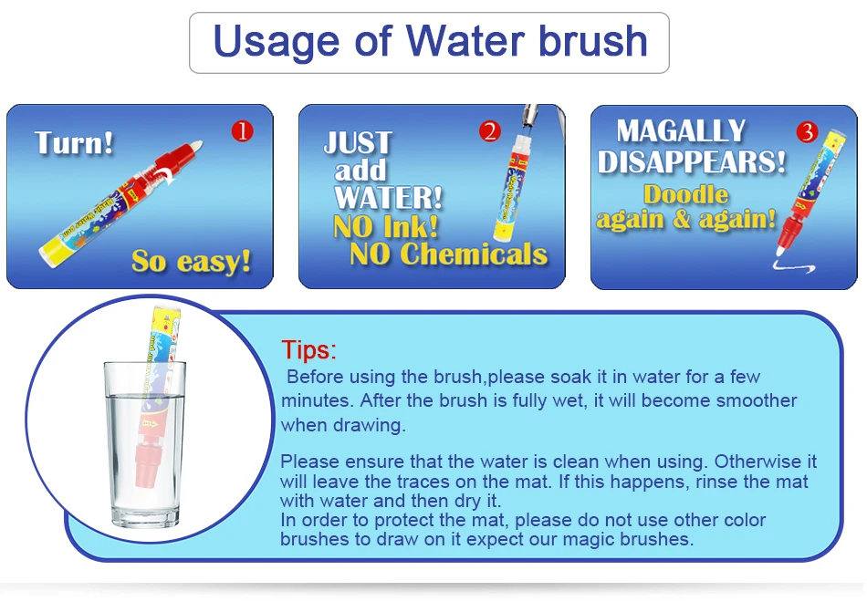 Fill the pen with clean water and draw on the magic drawing mat. After 3-10 minutes, it magically disappears (depending on temperature and airflow), and children can paint on the drawing mat again and again.