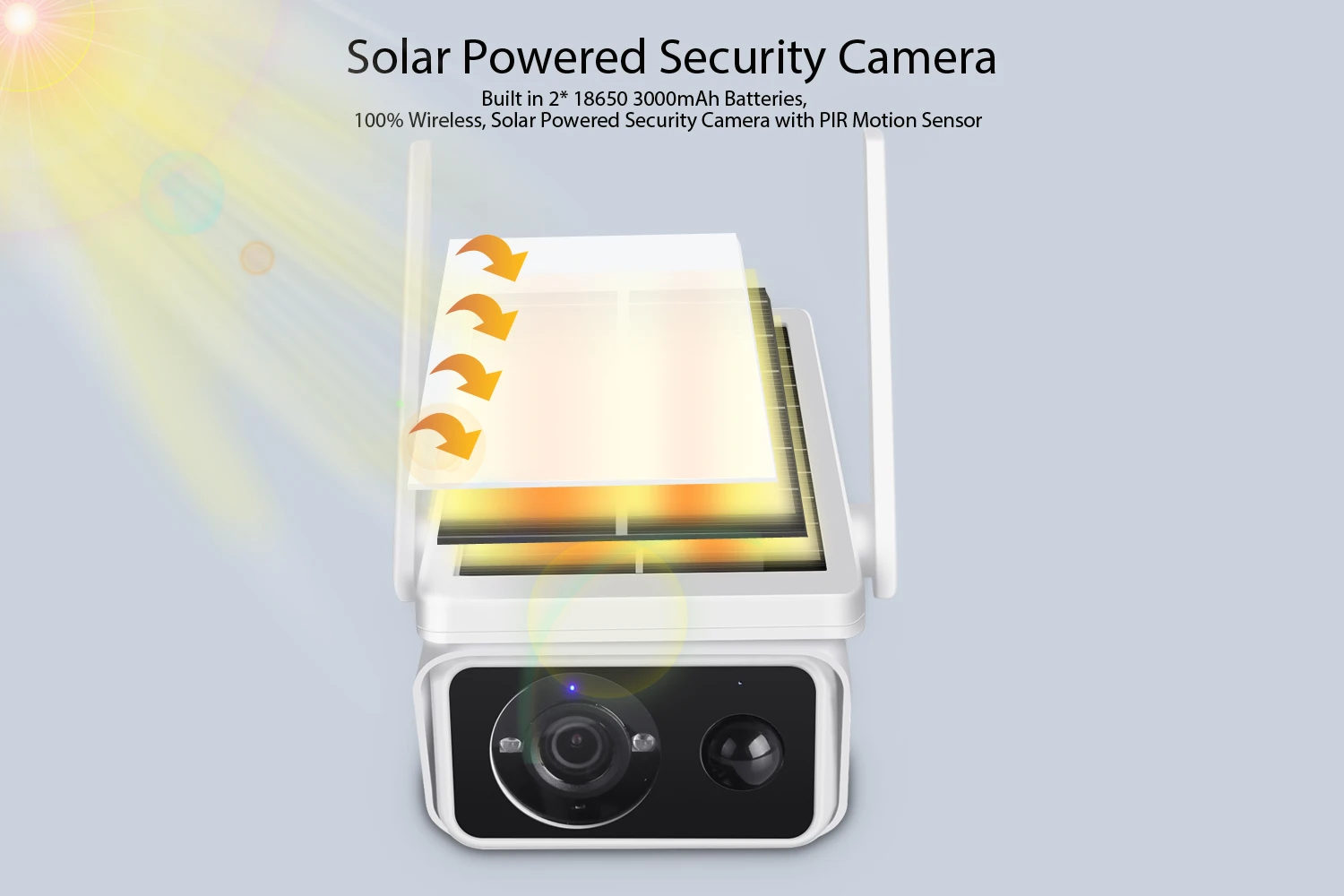 Поддержка аккумуляторов 2*18650 3000 мАч(Батарейки в комплект не входят), 100% беспроводная, Солнечная камера безопасности с PIR датчиком движения.