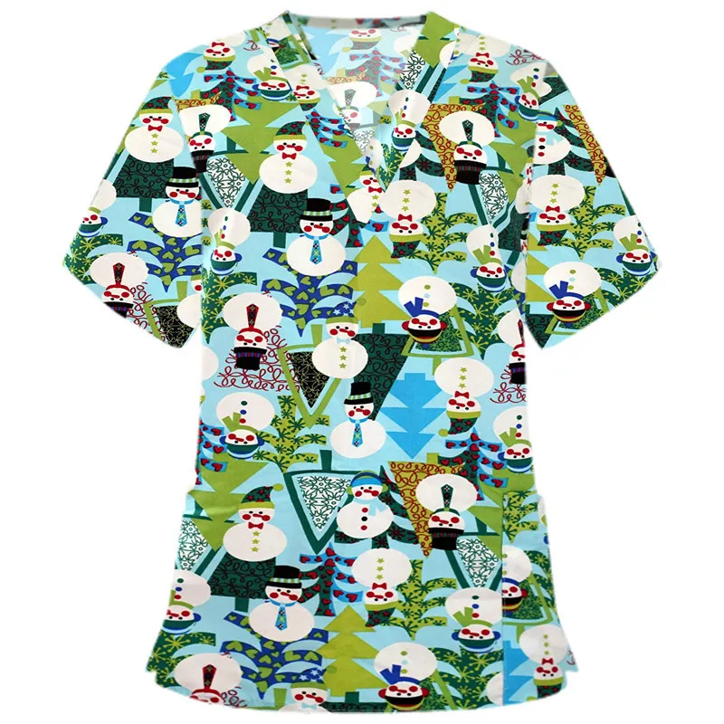 Новинка 2021, Женская рождественская одежда с принтом, топы для медсестер, повседневная женская форма с коротким рукавом, униформа для медсестры, футболка с карманом