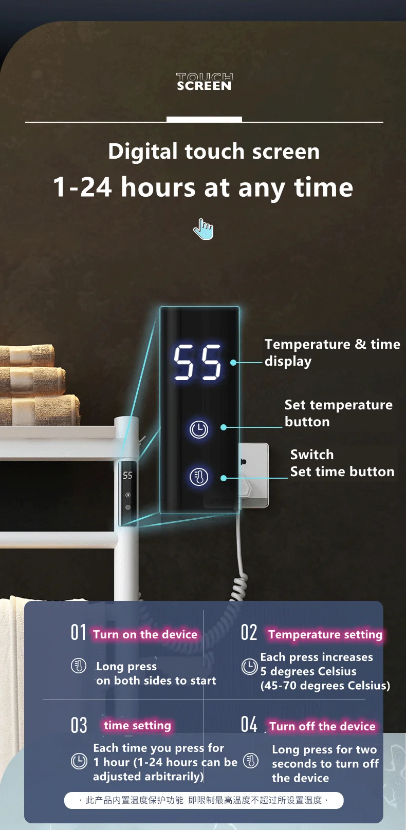 1:[вешалка для полотенец с таймером и контролем температуры] полотенцесушитель имеет встроенный таймер и регулируемый визуальный светодиодный индикатор температуры. Таймер может управлять кнопкой 1-24 часа, увеличиваться на 1 час каждый раз, а затем автоматически ВЫКЛЮЧАТЬСЯ. Нажмите кнопку контроля температуры, вы можете выбрать между 45 градусов Цельсия и 70 градусов Цельсия для регулировки, Каждый раз Отрегулируйте 5 градусов Цельсия. Это дает вам приятный, удобный теплый или сухой опыт, особенно в холодные месяцы.