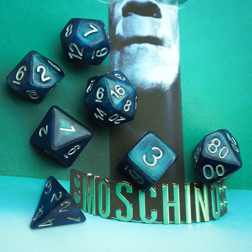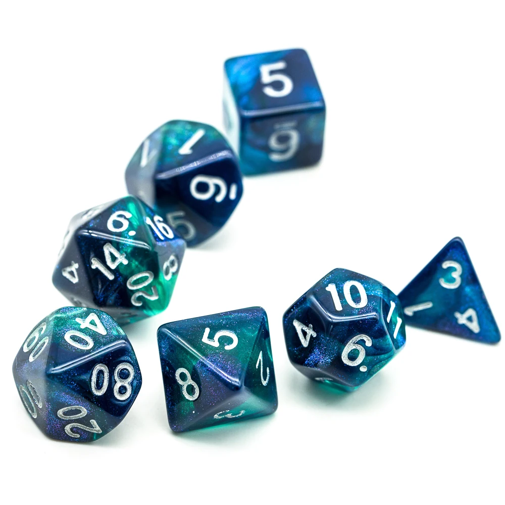 Это синие/зеленые двухцветные блестящие кости под разными углами, вы увидите разные цвета. Эти кости привлекают внимание и могут выиграть множество похвал на столе.