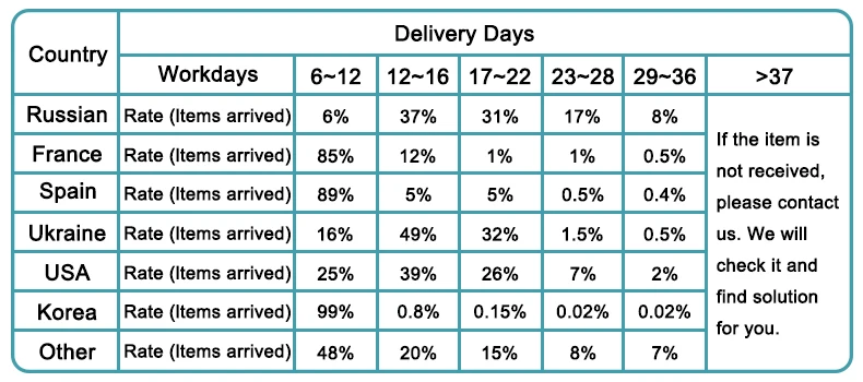 1. Обычное время доставки показано ниже. Кроме того, мы не можем гарантировать конкретное время доставки.
