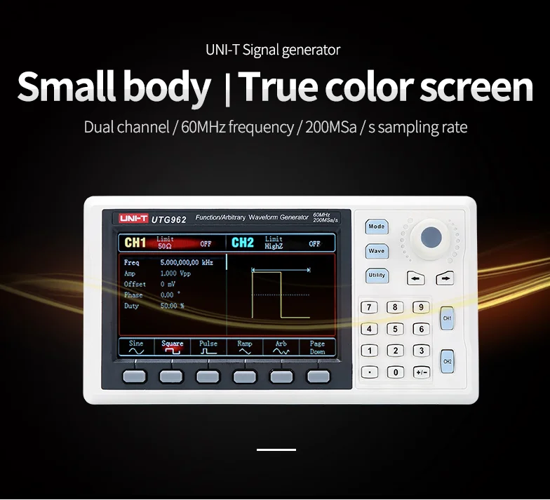 Формы выходного сигнала: синус, квадрат, пульс, пандус, шум, постоянный ток, произвольный