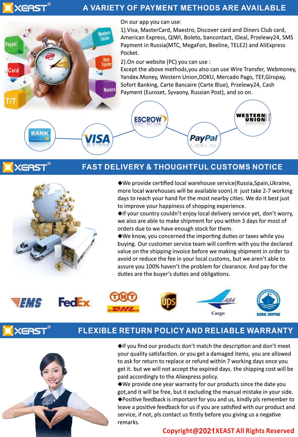 1.Если есть какие-то проблемы с нашей продукцией, мы поддерживаем обмен, возврат или возврат, но, пожалуйста, свяжитесь с нами и предоставьте четкое видео.
