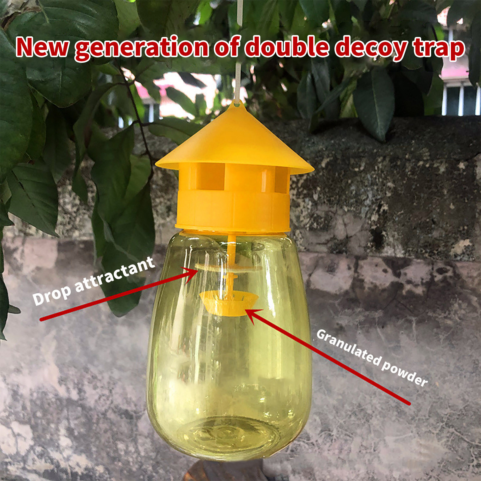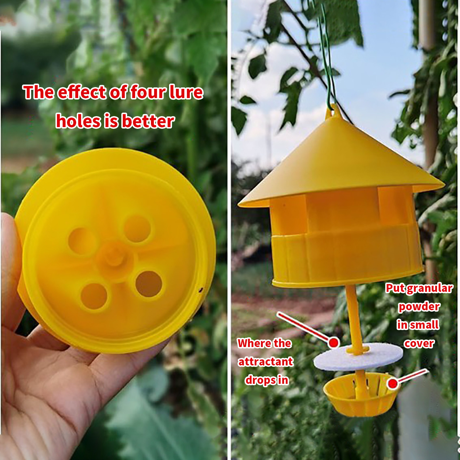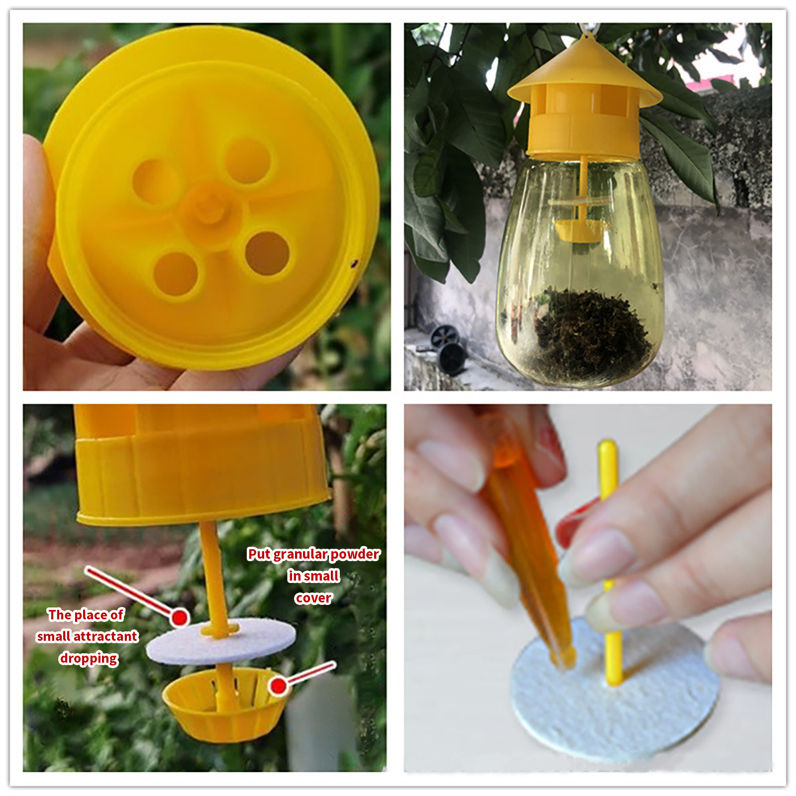 Новое поколение двухъядерных ловушек, эффективно и практично.Нанесение 3-5 капель аттрактанта на ядро приманки (добавление раз в месяц позже) ускорит гибель фруктовых мух в ловушке. Повесьте ловушку между навесом и верхней частью дерева. Лучше всего вешать его на внешней стороне сада и на нефруктовые деревья. Высота около 1,5 метров. Используйте 5-10 ловушек на acre для лучшего эффекта.