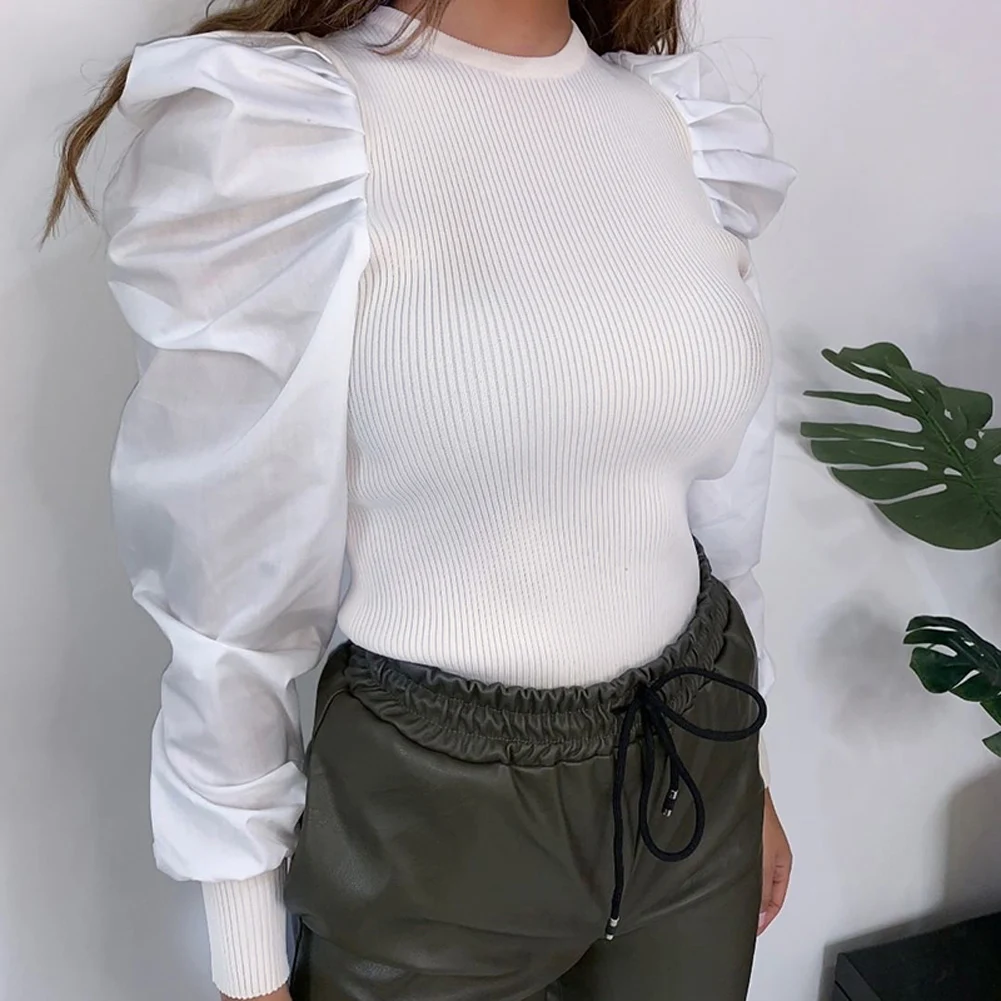 Модная женская одежда, женские длинные футболки с пышными сетчатыми рукавами и круглым вырезом, однотонные пуловеры, свободные топы из полиэстера