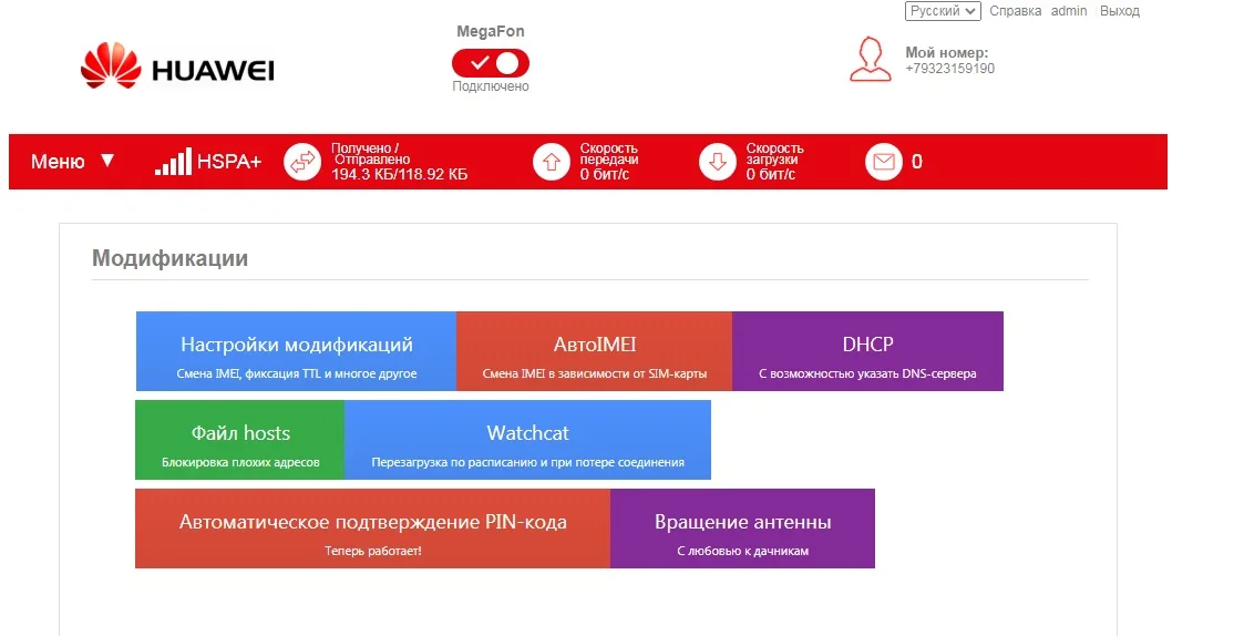 В модем залито оригинальное программное обеспечение от HUAWEI (Hilink). Все настройки делаются автоматически. Доступно управление через мобильное приложение Huawei Hilink (скачать можно с GooglePlay или App Store).
