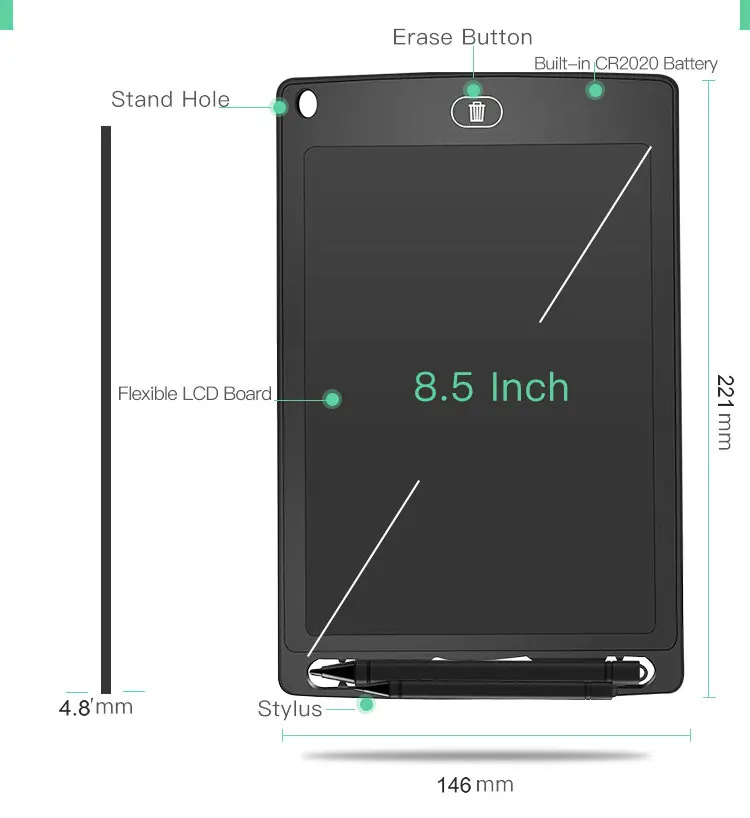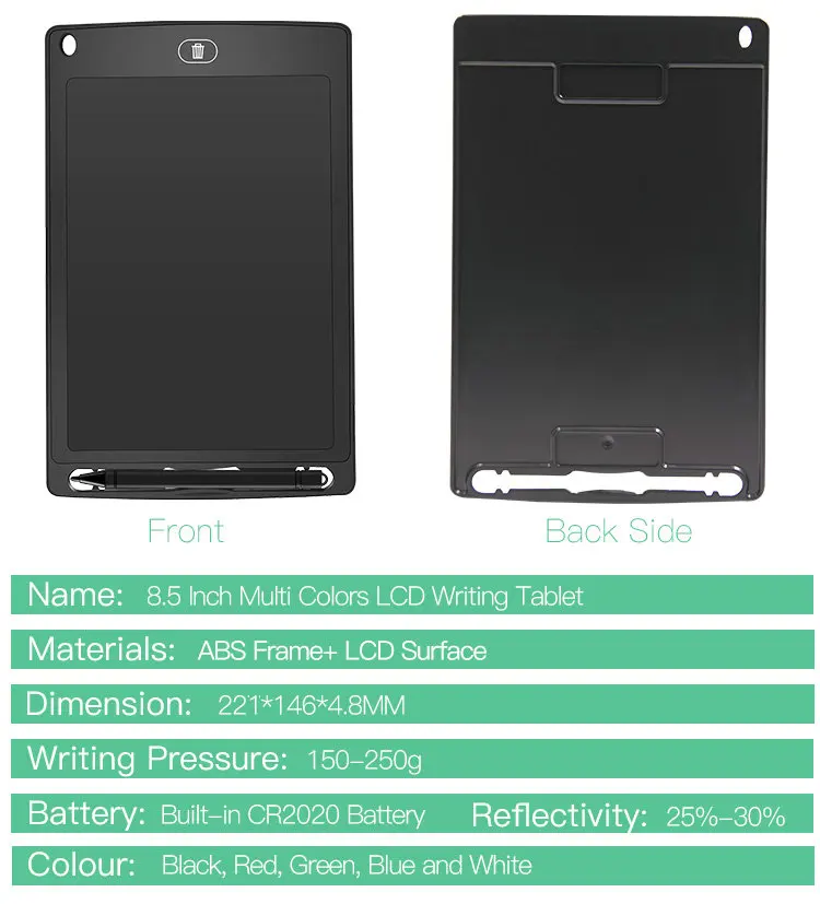 Чувствительная к давлению поверхность ЖК-дисплея делает ваше письмо или рисунок появляются без каких-либо задержек. Пишите или рисуйте с помощью прилагаемого пластикового стилуса или любого другого подходящего инструмента, даже пальцем! Простота в эксплуатации и высокая эффективность, Стирайте рисунок одним нажатием кнопки стирания. Ультратонкий и компактный дизайн, Легко носить с собой и легко скользить в ваш портфель, рюкзак или другую сумку. Легкий и портативный, идеально подходит для школы, офиса, домашнего использования или другого использования. Встроенный сменный кнопочный элемент.
