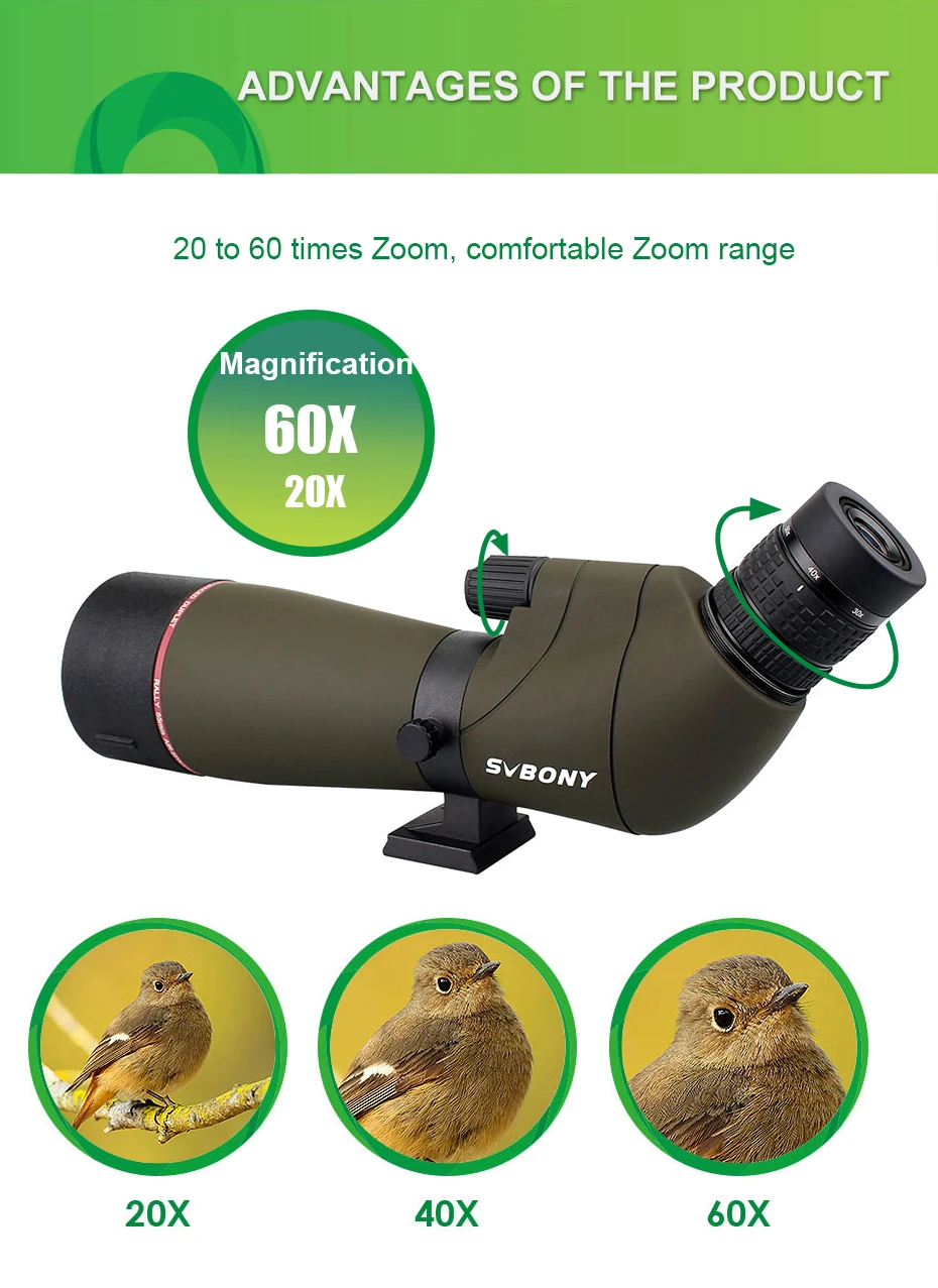 SVBONY SV13 65mm Spotting Scope Multi-Coated Optics 20-60x Zoom Refractor 45-Degree Viewing Angle