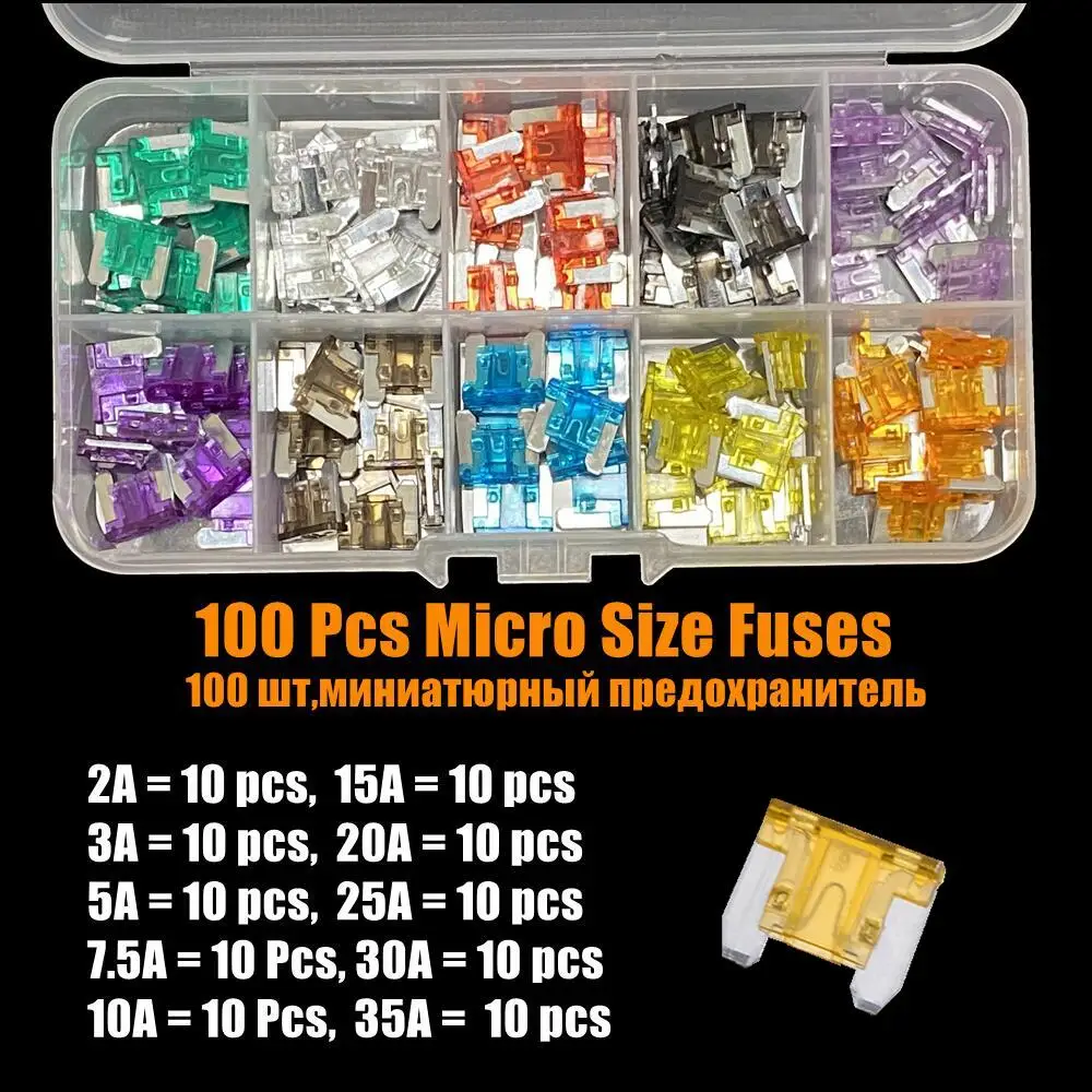 100 шт. микро автомобильный предохранитель с автоматическим лезвием 2A 3A 5A 7.5A 10A 15A 20A 25A 30A 35A Ампер ассортимент в коробке для хранения