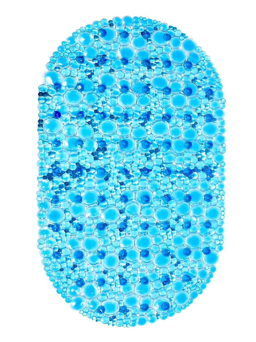 Коврик противоскользящий для душа и ванной Линза голубой 67х38 см овальной формы. Подходит для всех видов ванн и душевых кабин. Специальные отверстия предназначены для стекания воды. Достоинство – из первосортного сырья. Хорошо фиксируется на вакуумных присосках