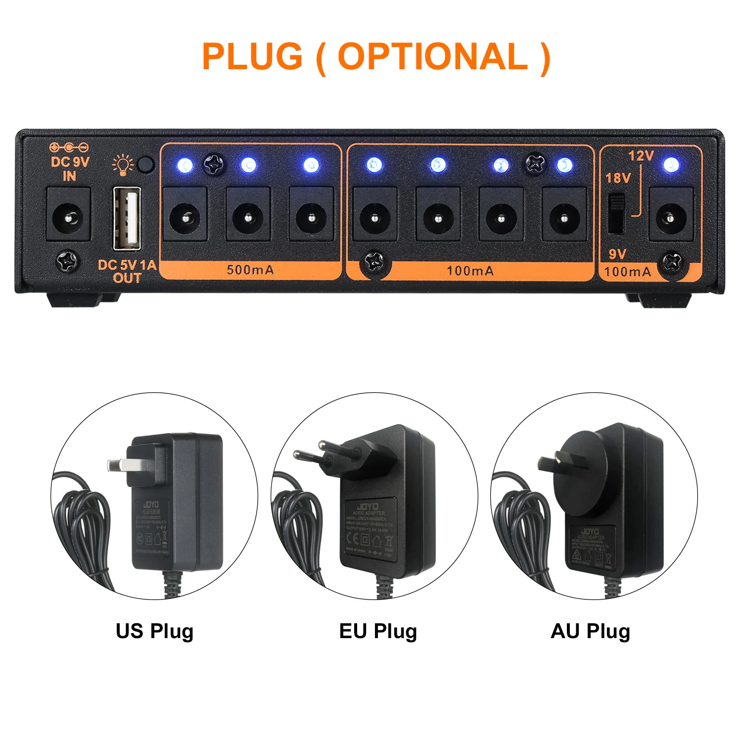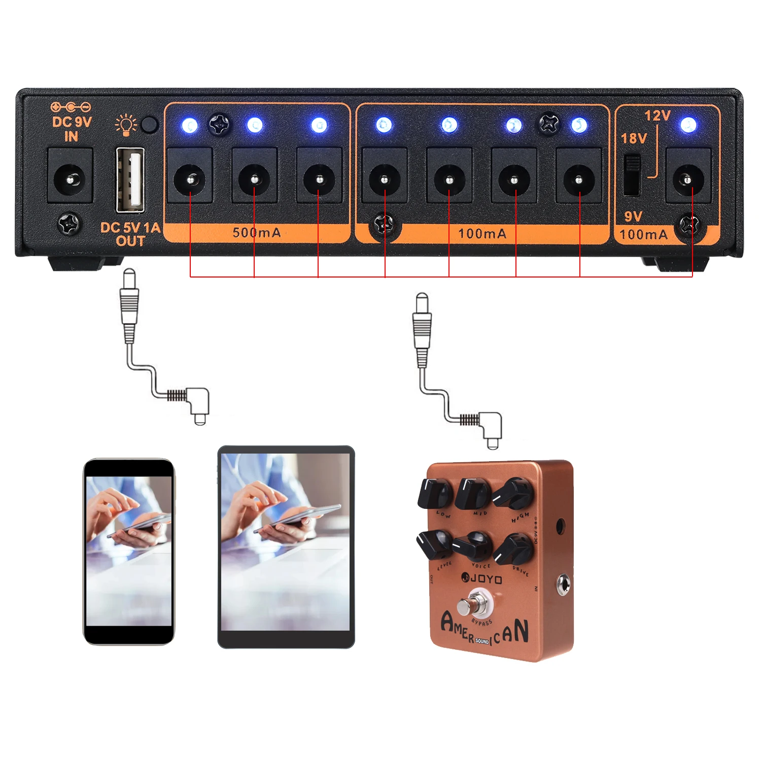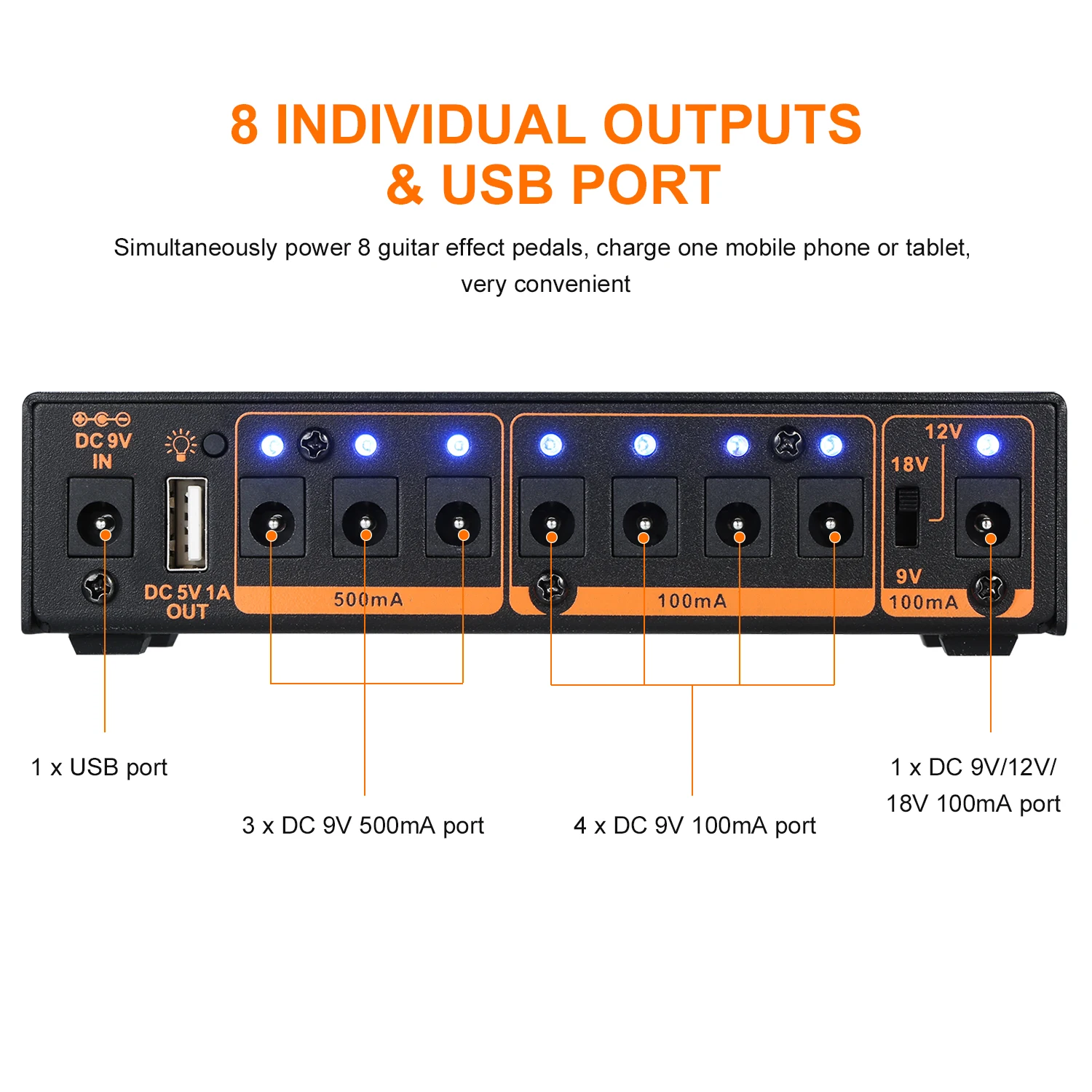 8 отдельных выходов: 9 В 100 мА порт x 4, 9 в 500 мА порт x 3, 9 В/12 В/18 в 100 мА порт x 1.