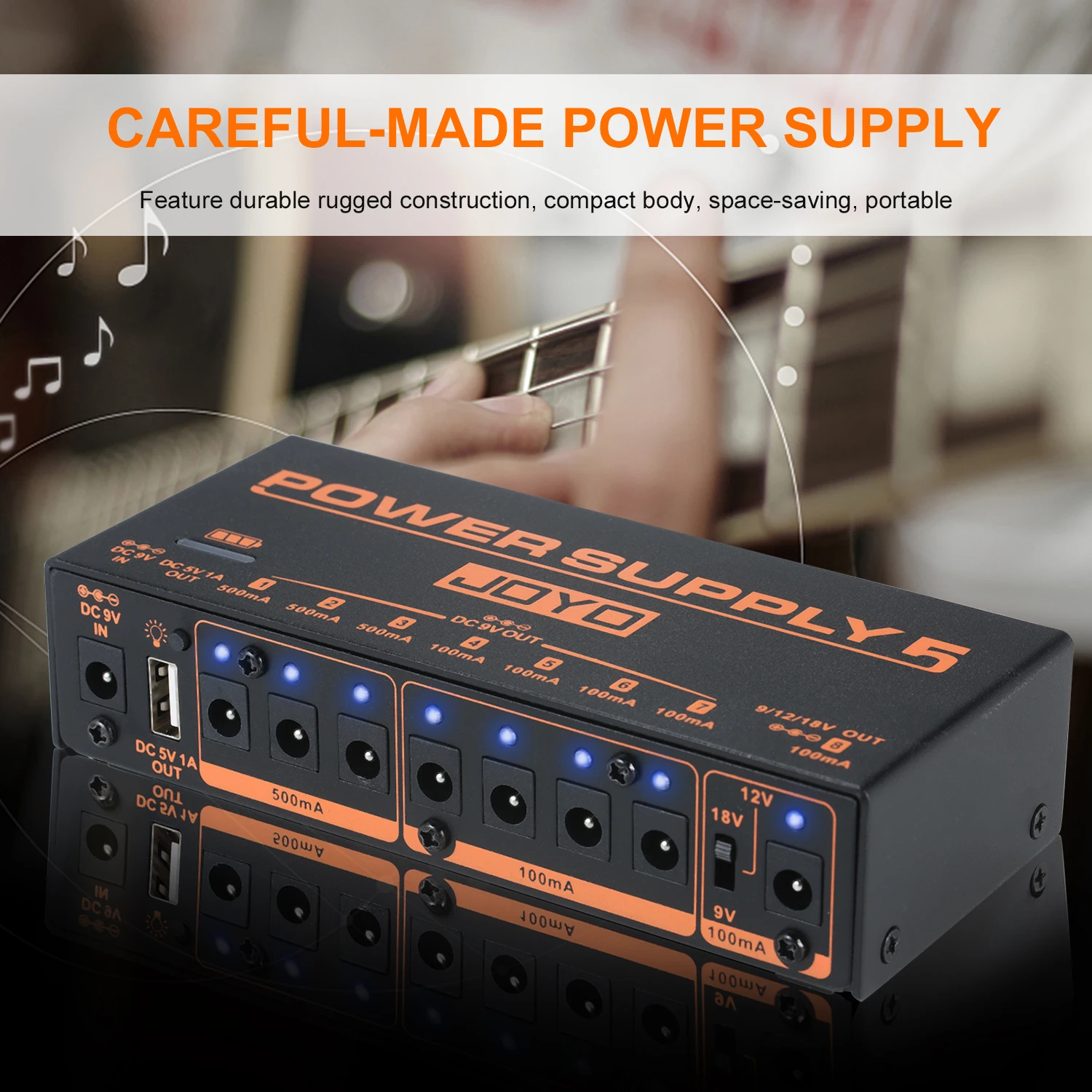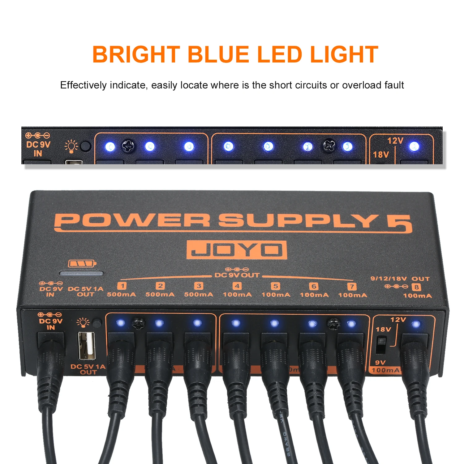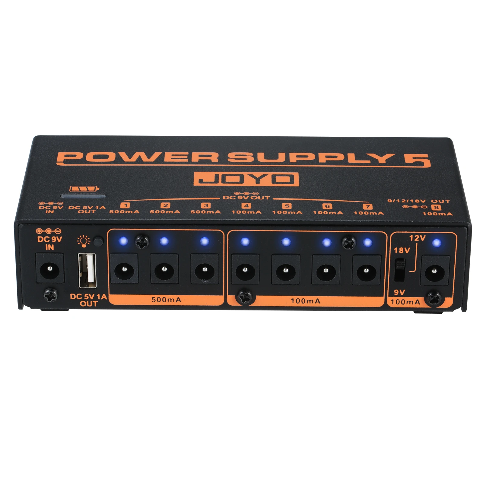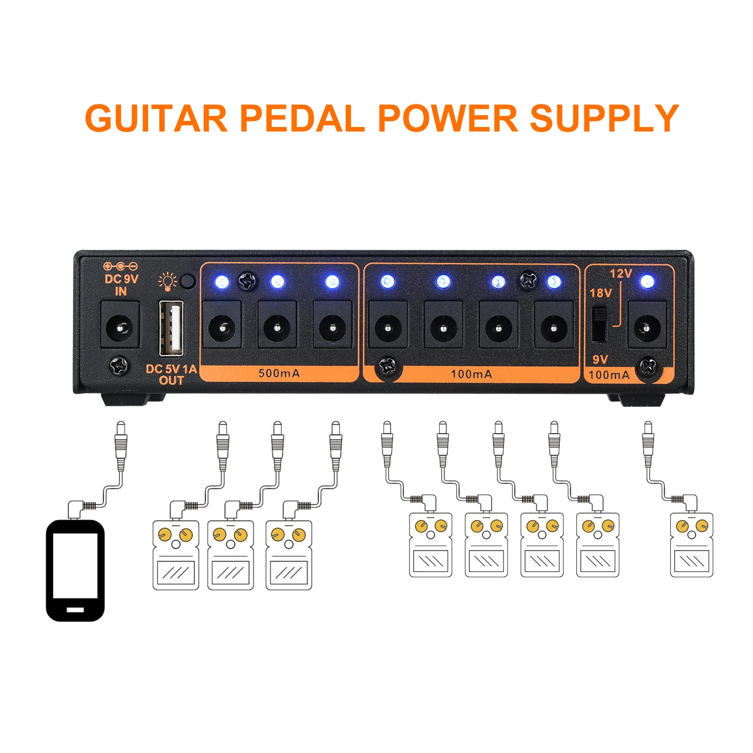 8 отдельных выходов: 9 В 100 мА порт x 4, 9 в 500 мА порт x 3, 9 В/12 В/18 в 100 мА порт x 1.