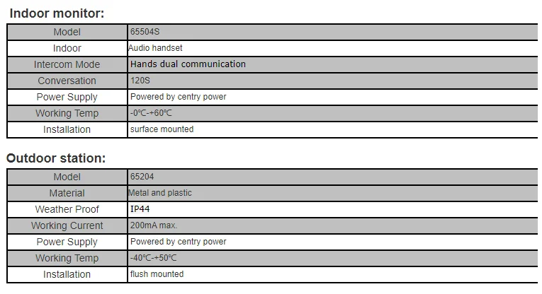 Metal panel for outdoor station and ABS plastic for indoor handset.