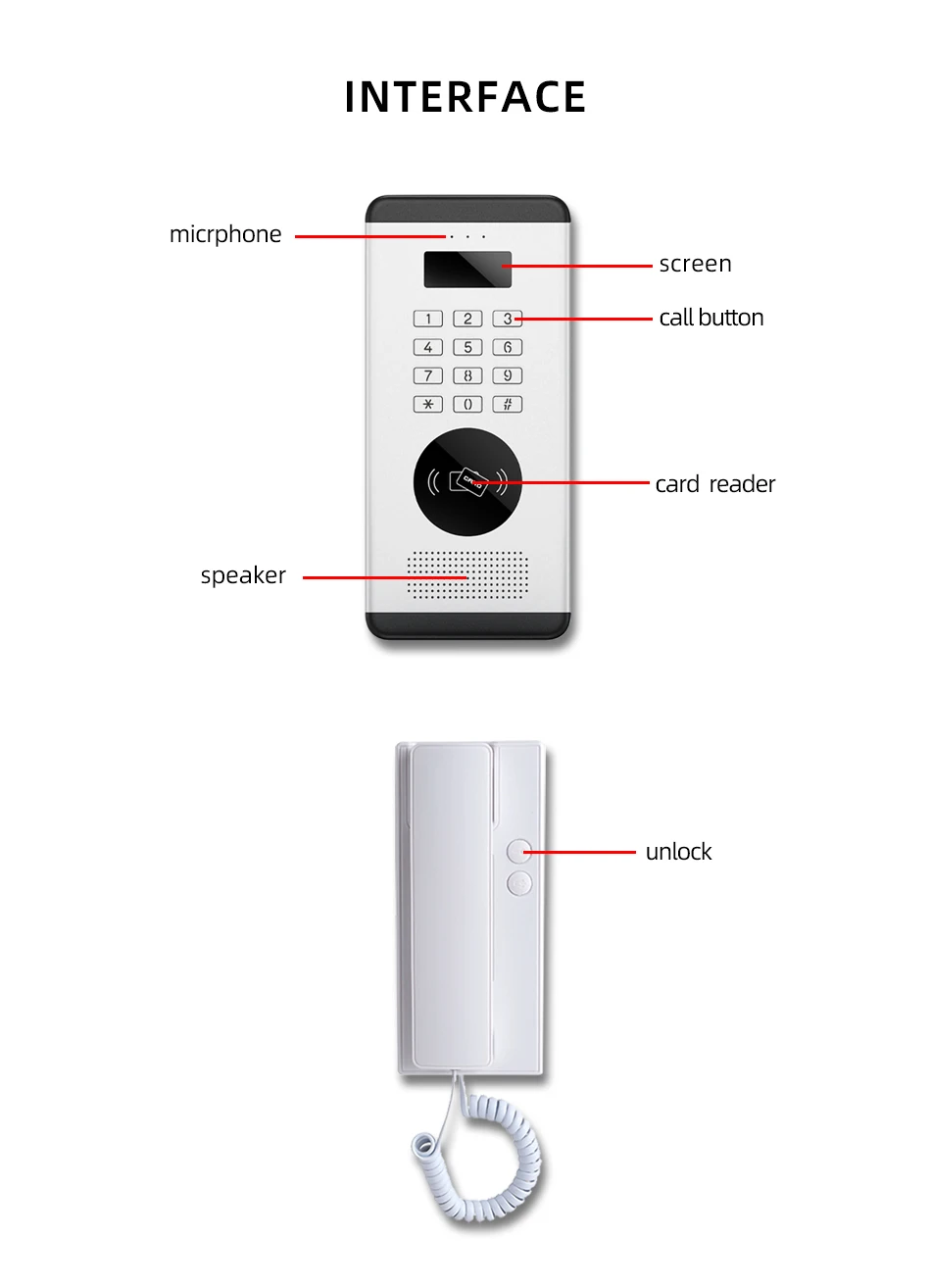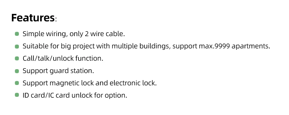 This is a 2-wire walkie-talkie doorbell with card unlocking function, which can be matched with up to 9,999 indoor handsets.