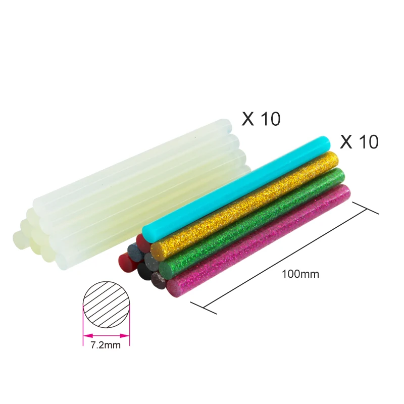 2. Клеевой пистолет + 10 прозрачных палочек + 10 цветных палочек