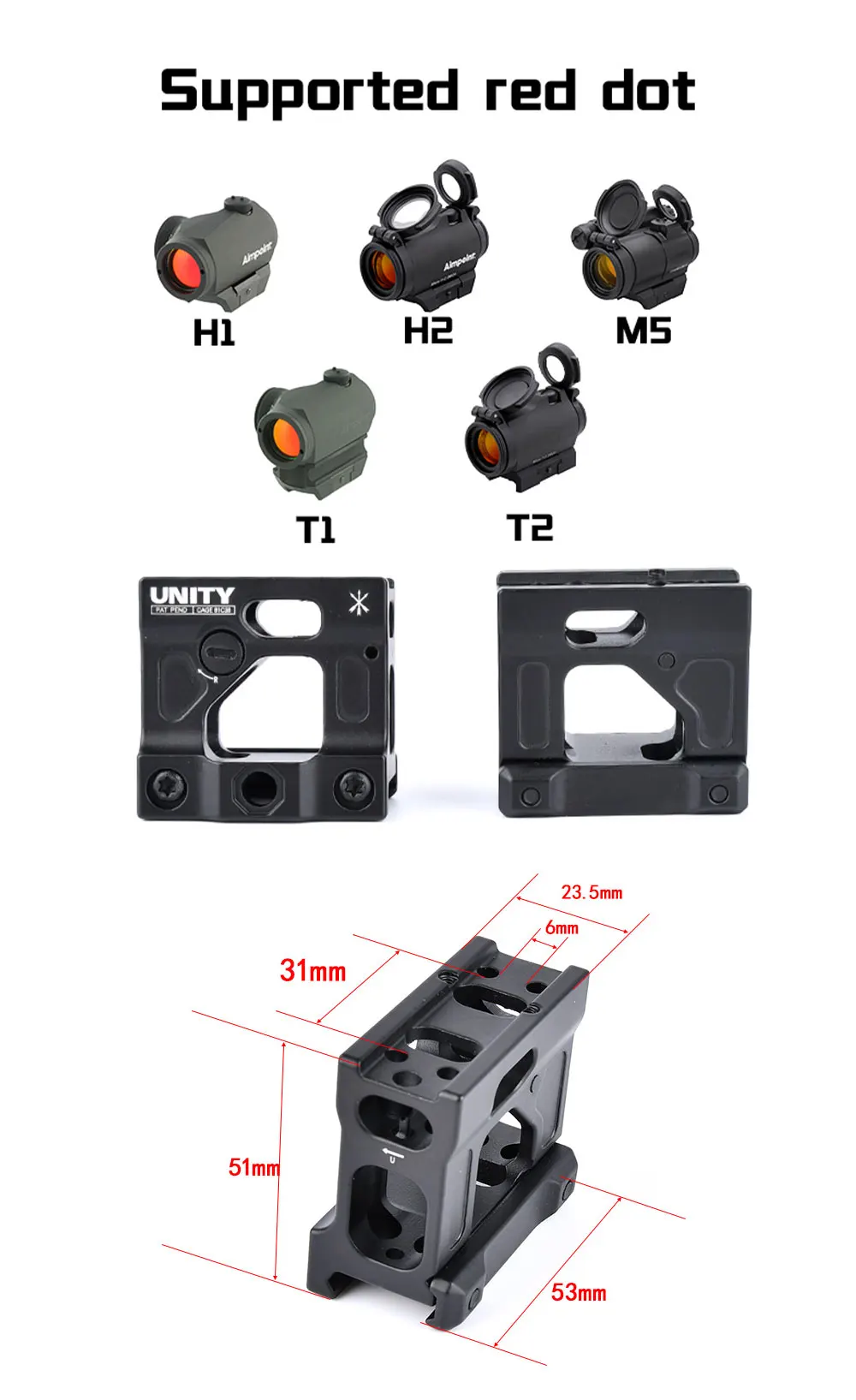 Предназначен для Aimpoint Micro (H1, H2, T1, T2, CompM5) и другой оптики с Aimpoint Micro Foot, такой как те, которые находятся на многих Sig Sauer, Holosun, первичных дужках, И платформы вихревой оптики.