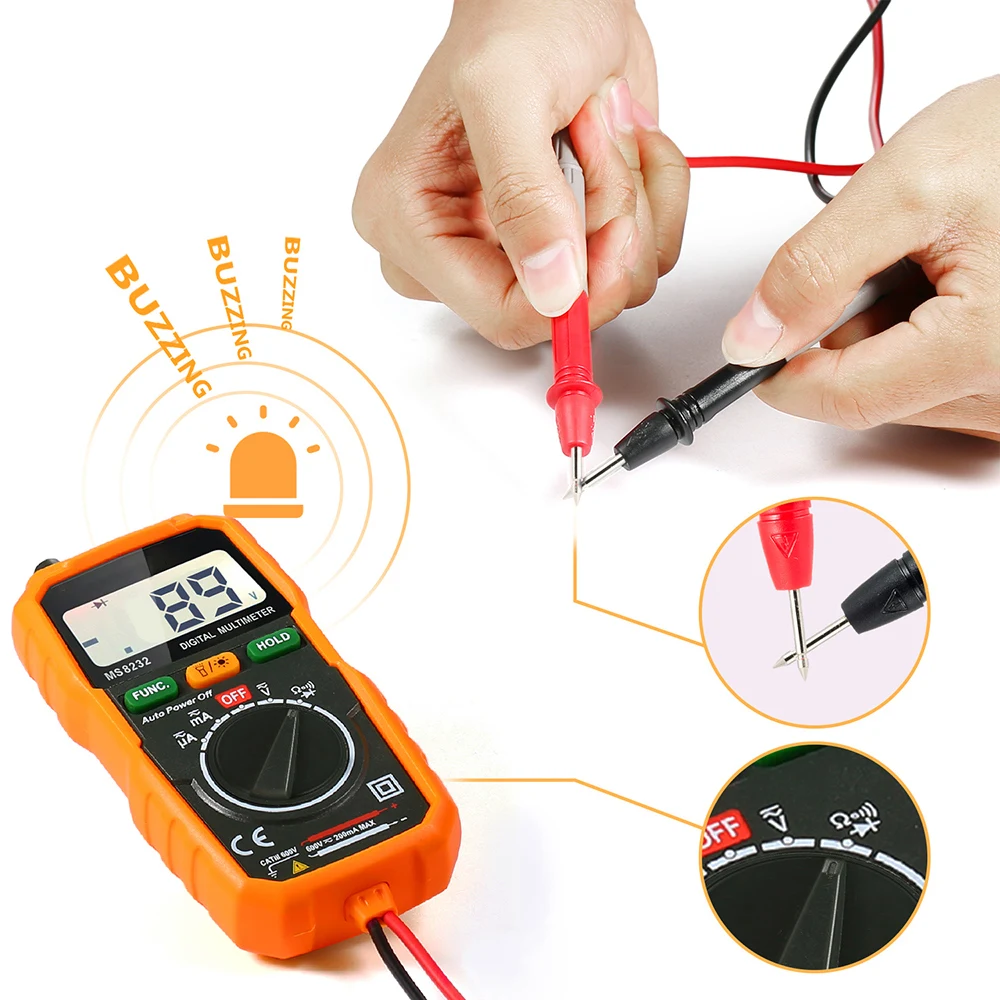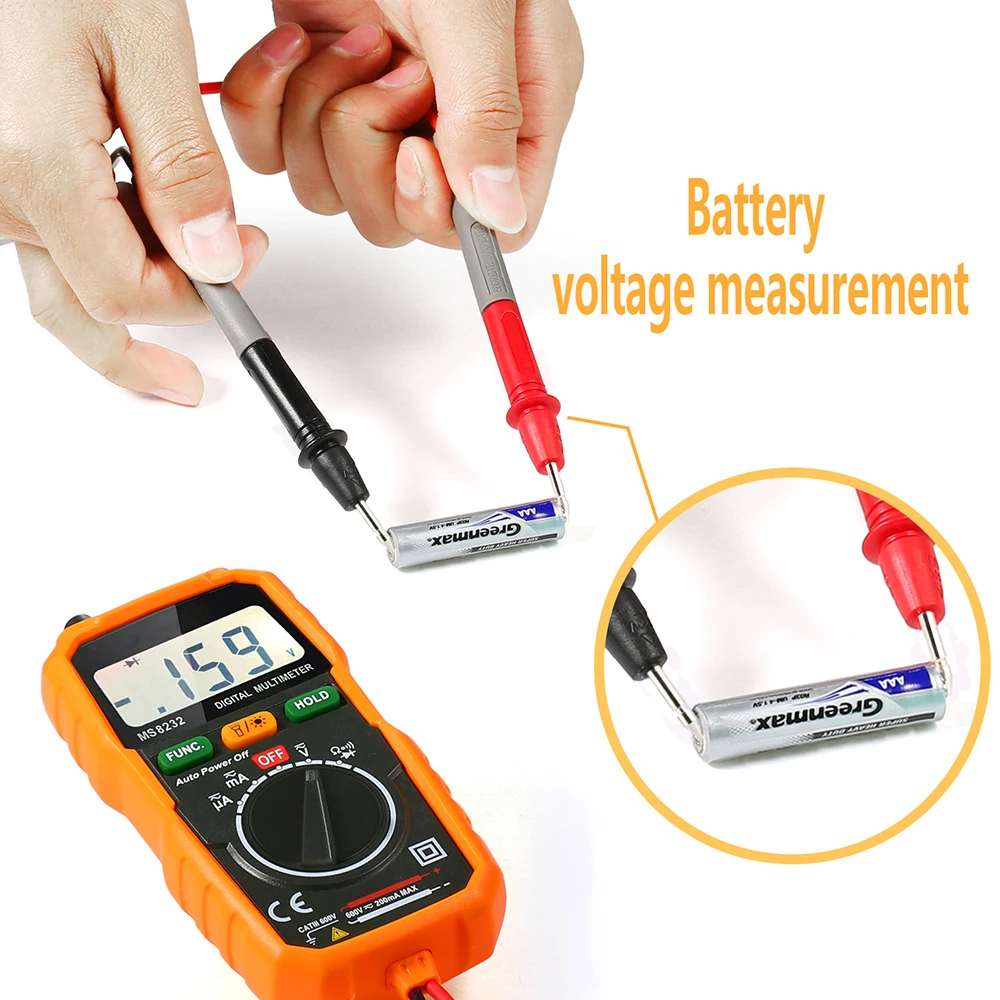 1. Режим работы: Автоматический диапазон 2. Напряжение переменного тока: 2 В/20 В/200 В/600 В 3. Напряжение постоянного тока: 200 мВ/2 в/20 в/200 В/600 в 4. Переменный ток: 200uA/2000uA/20mA/200mA 5. Постоянный ток: 200uA/2000uA/20mA/200mA 6. Дисплей: 2000 подсчетов 7. Рабочая температура: 0 - 40 ℃ 8. Хранение данных: да 9. Непрерывность: Да 10. Бесконтактное напряжение (NCV): Да 11. Светодиодный светильник: Да 12. Подсветка: Да 13. Диапазон измерения тока: стабильная производительность 14. Сопротивление: 200 Ом/2 кОм/20 кОм/200 кОм/2 МОм/10 МОм 15. Уровень безопасности: EN61010-1,-2-030,EN61010-2-033,EN61326-1,CAT.III 600V 16. Мощность: 2x1,5 V элемент питания AAА (в комплект не входит)