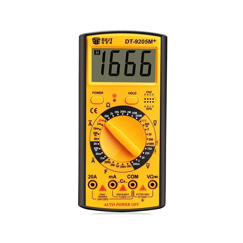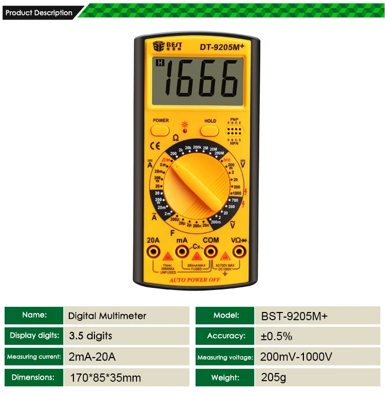 Цифровой мультиметр DT9205M-это простой в эксплуатации, точные показания, полнофункциональный, портативный, портативный мультиметр с большим ЖК-экраном, цифровой мультиметр с тремя с половиной, стол можно использовать для измерения напряжения/тока постоянного тока, напряжение/ток переменного тока, сопротивление, тест емкости, тест диодов, Измерения и цепные транзисторы HFE-off и так далее. Для проектирования, лабораторий, производственных испытаний, мастерских, полевых операций и промышленного обслуживания.