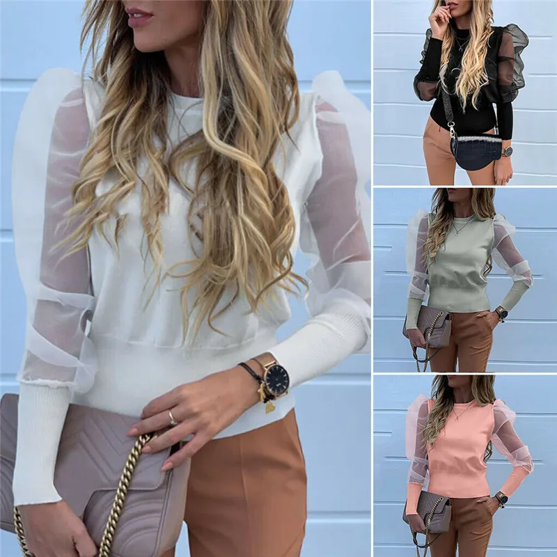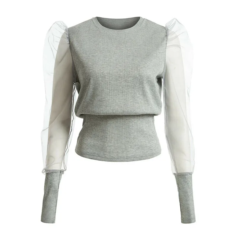 Модная женская одежда, Женские Длинные Пышные сетчатые топы с рукавами и круглым вырезом, пуловеры, свободные футболки из полиэстера