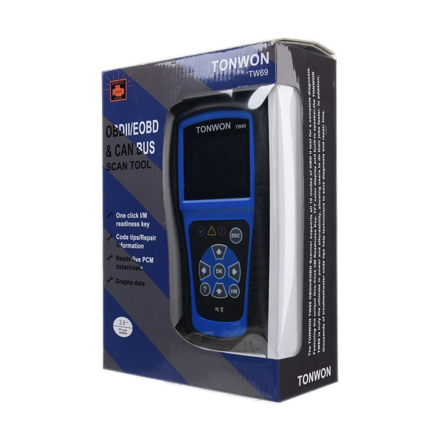 TW69 Легко определяет причину проверки двигателя светильник (MIL). Отключает контрольный светильник двигателя (MIL), очищает коды и сбрасывает мониторы. Отображает определения DTC на цветном tft-экране. Просмотр данных о замораживании кадра.