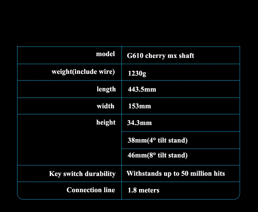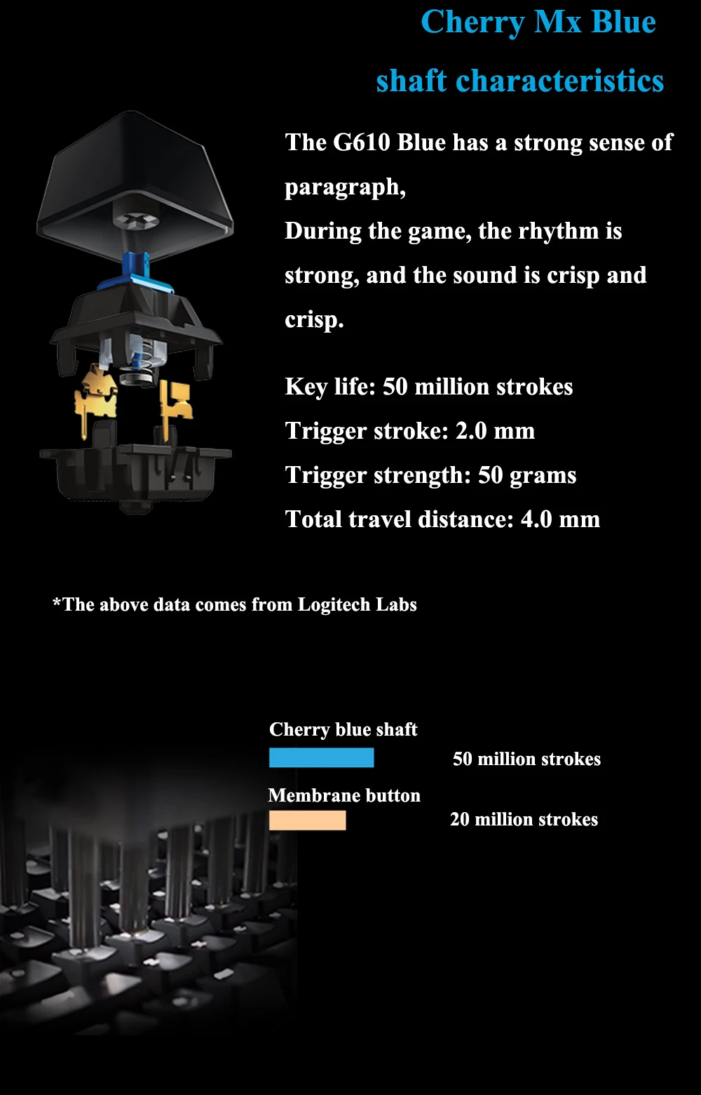Основные характеристики1. Вишневый Mx Синий Особенности:Синий G610 имеет сильное чувство абзаца,Во время игры, ритм сильный, и звук четкий и четкий.Основной срок службы: 50 миллионов штриховХод запуска: 2,0 ммСила срабатывания: 50 граммовОбщее расстояние в пути: 4,0 мм* Вышеуказанные данные получены от Logitech Labs
