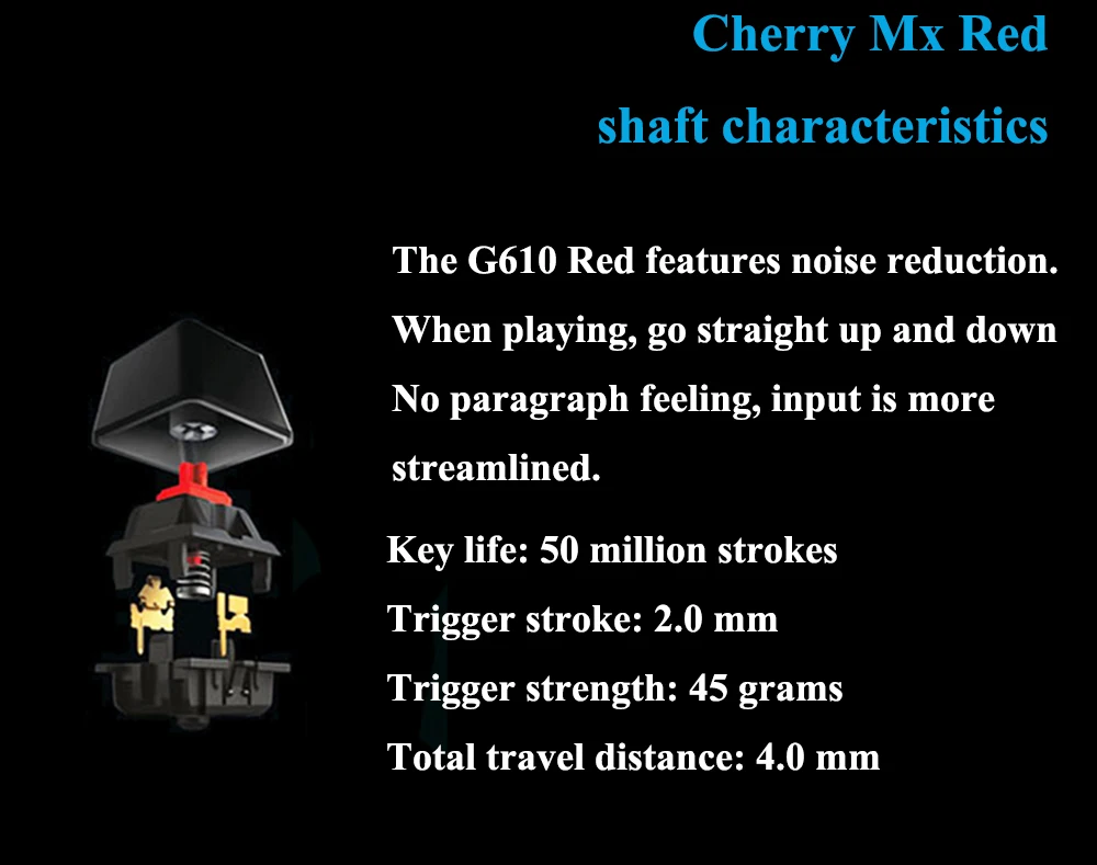 2. Вишневый Mx Красный Особенности:Красный G610 имеет шумоподавление. Во время игры перейдите прямо вверх и внизНет ощущения абзаца, вход более обтекаемый.Основной срок службы: 50 миллионов штриховХод запуска: 2,0 ммСила срабатывания: 45 граммовОбщее расстояние в пути: 4,0 мм* Вышеуказанные данные получены от Logitech Labs