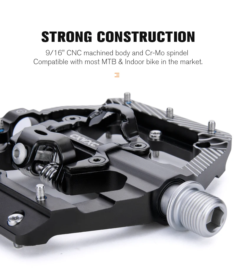 【DUAL FUNCTION】: Это Двусторонняя велосипедная педаль, одна сторона имеет традиционную платформу для использования с обычной обувью, И другой-это пошаговый дизайн SPD для использования с велосипедной обувью SPD. Бутсы SPD включены.