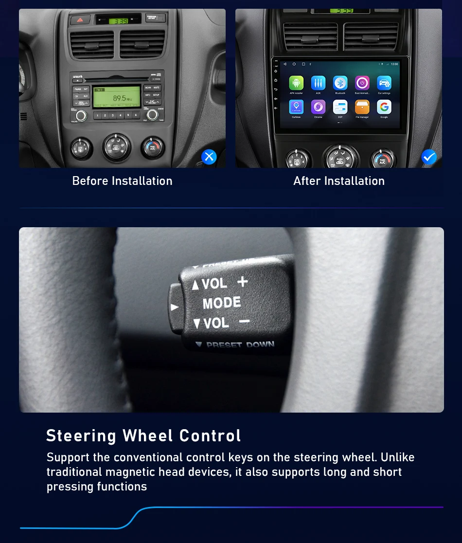 По сравнению с оригинальным автомобилем, экран больше, цвета более яркие, и он поддерживает просмотр под разными углами. Новая рама сделана в соответствии с оригинальным автомобилем, который идеально сочетается с вашим автомобилем и прост в установке.