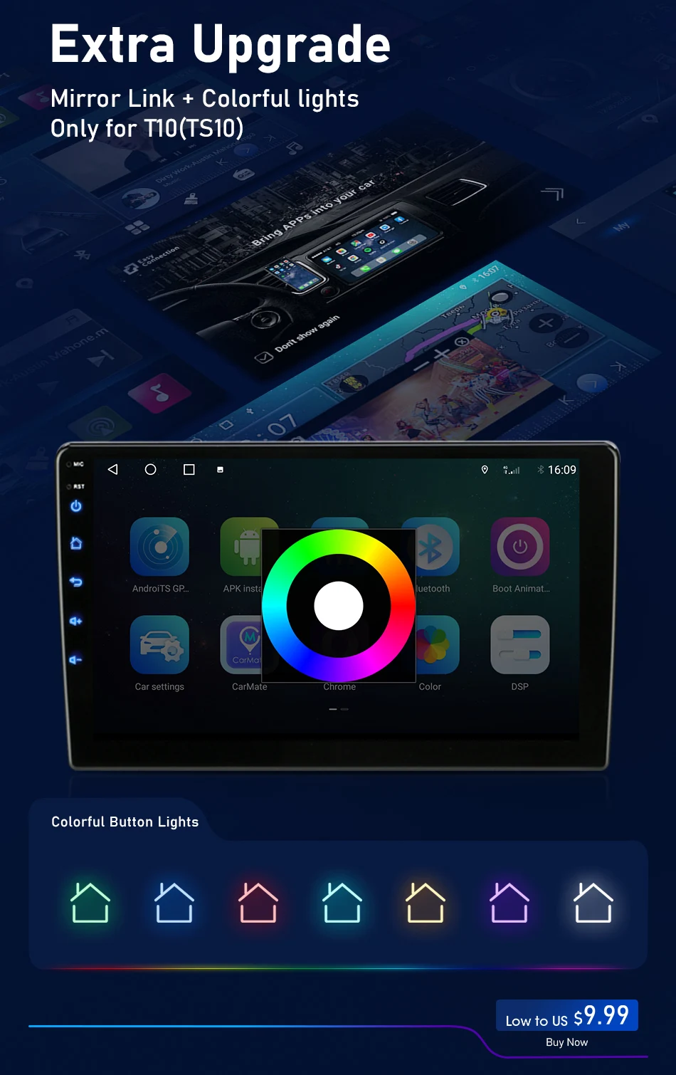 Покупка дополнительных функций (только для моделей TS10): Простое подключение: 1. Мобильный телефон с зеркальным подключением (Android и IOS) 2. Двухканальное соединение (можно управлять как головным устройством, так и мобильный телефон). Красочные огни: В 7 видов цветов на круглую кнопку на стороне может быть отрегулировано