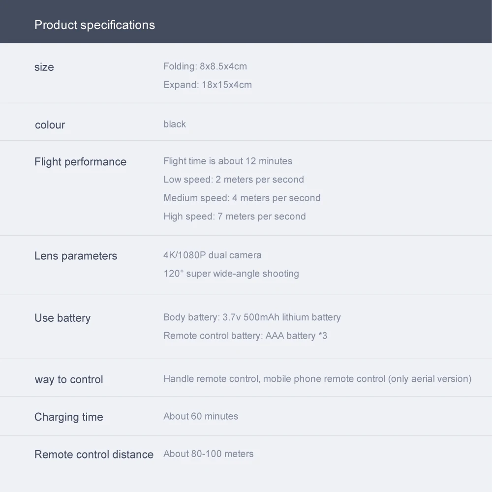 -Складные ручки, небольшой размер всего 8 см, легко носить с собой. -Кнопка удержания высоты обеспечивает стабильность полета. -Безголовый режим позволяет избавиться от необходимости корректировки положения дрона перед полетом. -Один ключ Взлет/посадка/возврат. Легко находите свой путь домой с помощью функции возврата на одну кнопку. -Встроенная hd-камера 500 Вт пикселей/4K пикселей. Удивительно, но он может захватывать Потрясающие фотографии и видео с неба. -Двойной переключатель камеры, избавьтесь от фиксированного угла обзора. -С функцией Wi-Fi, он может быть подключен к приложениям, системе APK, и делать фотографии, видео и передачу в реальном времени через изображения камеры мобильного телефона. -Нарисуйте траекторию полета на экране, Дрон будет лететь автономно по указанному пути. -VR 3D опыт. Через мобильное приложение с очками VR вы можете почувствовать пустоту с точки зрения. -MV производство, музыкальное дополнение. -3,7 в 500 мАч модульный аккумулятор, легко установить и взять, срок службы батареи до 12 минут. -Во избежание радиопомех 2,4 ггц. -4 канала для подъема, спуска, вперед, назад, влево полета, правого полета и 360 ° крена. -Шестиосевой гироскоп, более плавный полет и более удобное управление. -Светодиодные фонари делают полет более эффектным, особенно в темноте. Функции: вверх/вниз, вперед/назад, влево/вправо поворот, боковой полет, светодиодный свет, Безголовый режим, автовозврат одной кнопкой, режим удержания высоты, Поворот на 360 °, Wi-Fi FPV