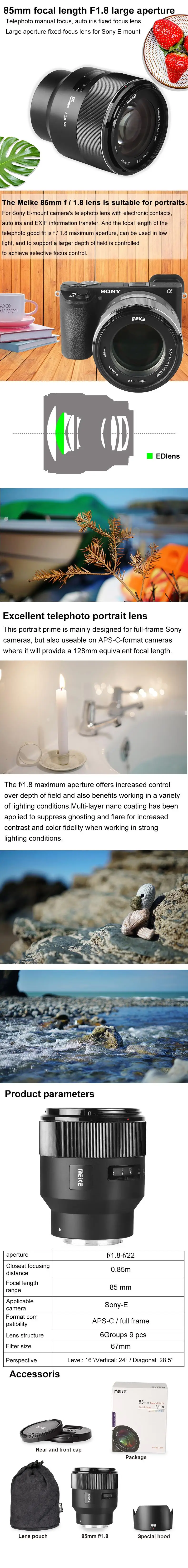 MEIKE 85 мм F1.8 объектив камеры с фиксированным ручным фокусом поддерживает APS-C/объектив с полной оправой для SONY E mount Camera A7RIII A7III A7M3