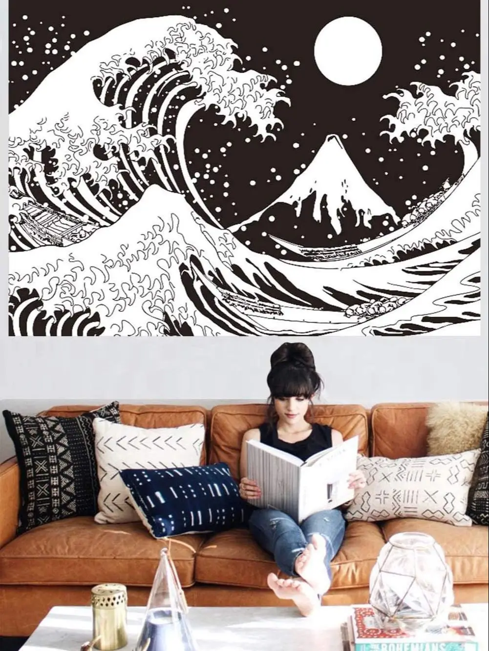 Большой размер 90x70 дюймов японский гобелен с волной океана канагава большая волна гобелен с Луной гобелены черно-белый гобелен