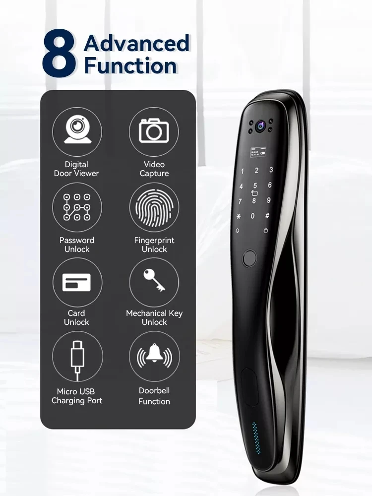 Характеристики продукта: отпечаток пальца + магнитная карта + пароль + ключ + видео открытое отверстие + Удаленная разблокировка + Запись разблокировки + дверной звонок + автоматический переключатель блокировки