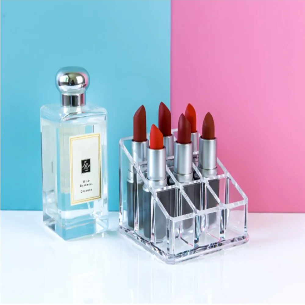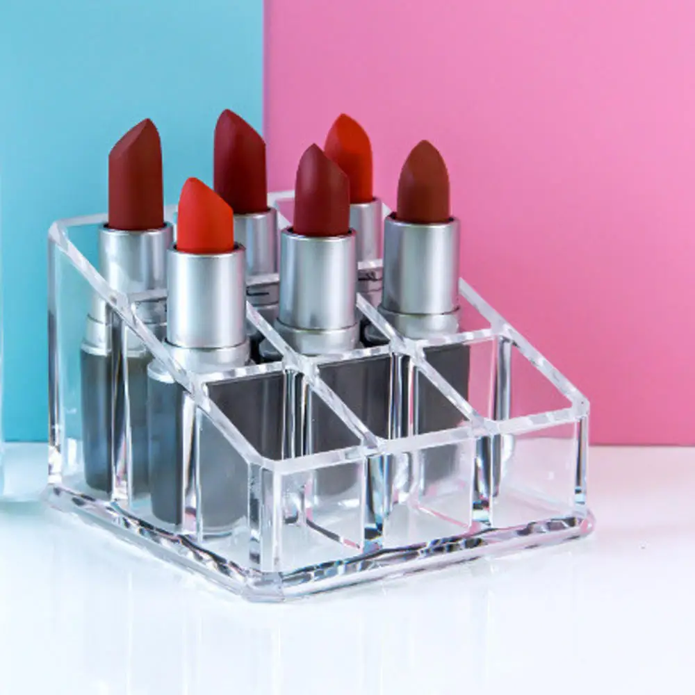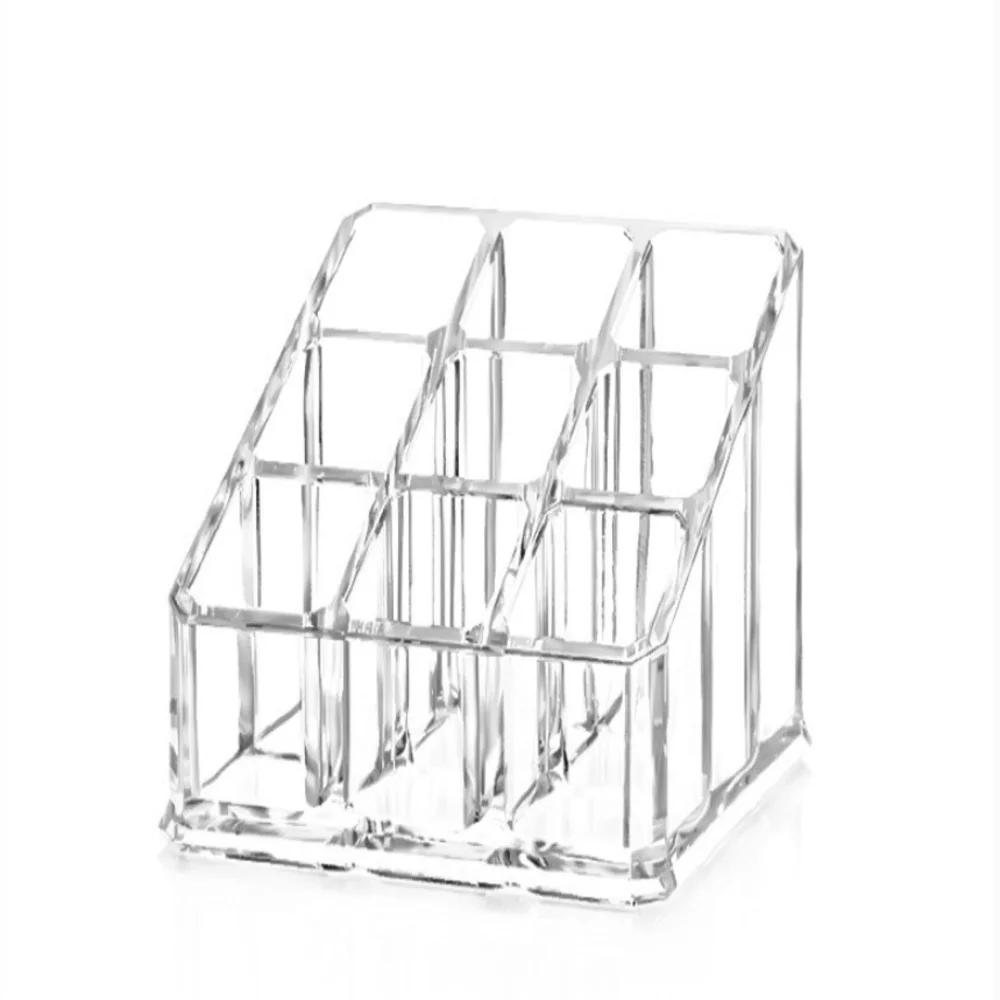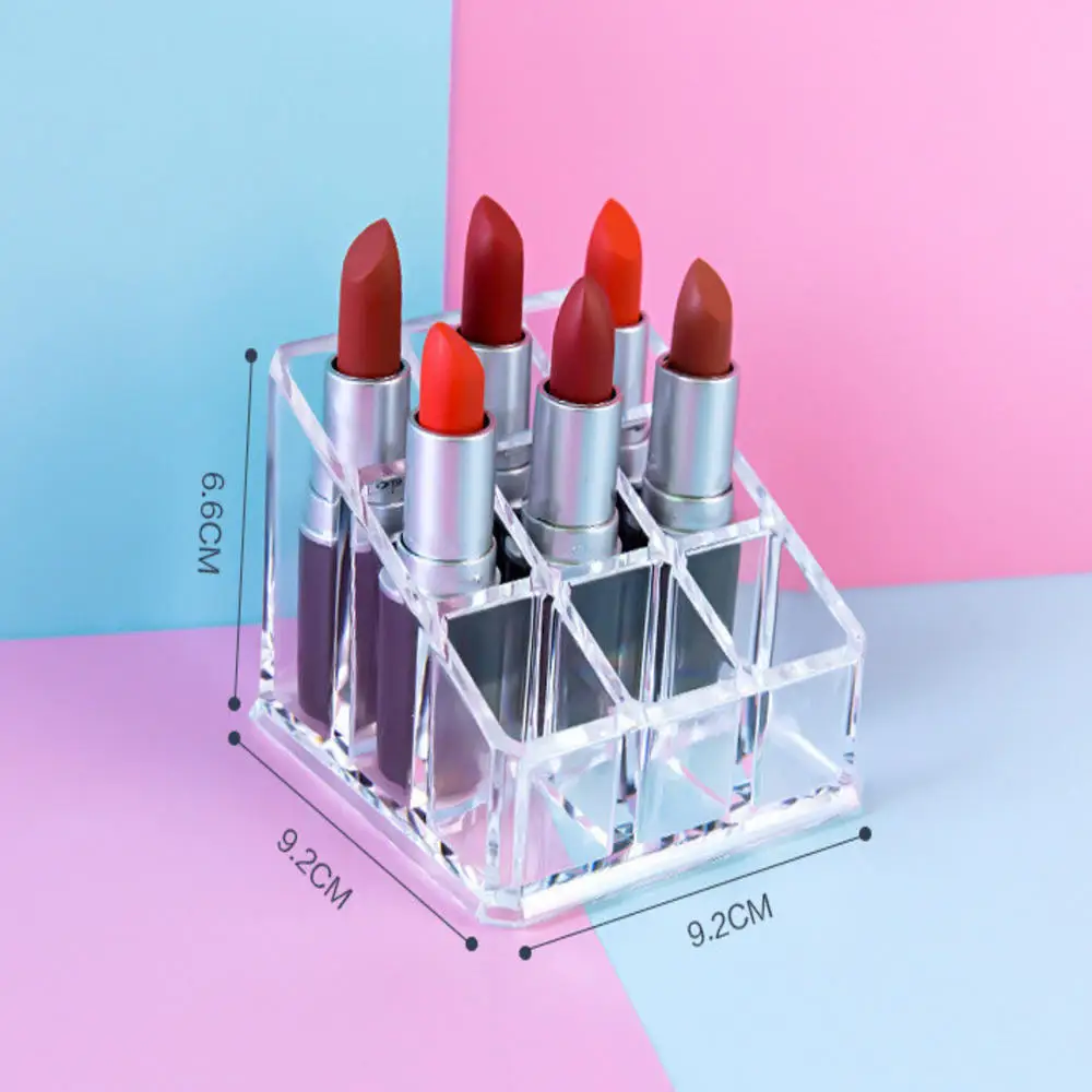 С 9 отделениями дизайн стойки для хранения, маленькая коробка может держать 9 помад. Он не занимает места и легко помещается.